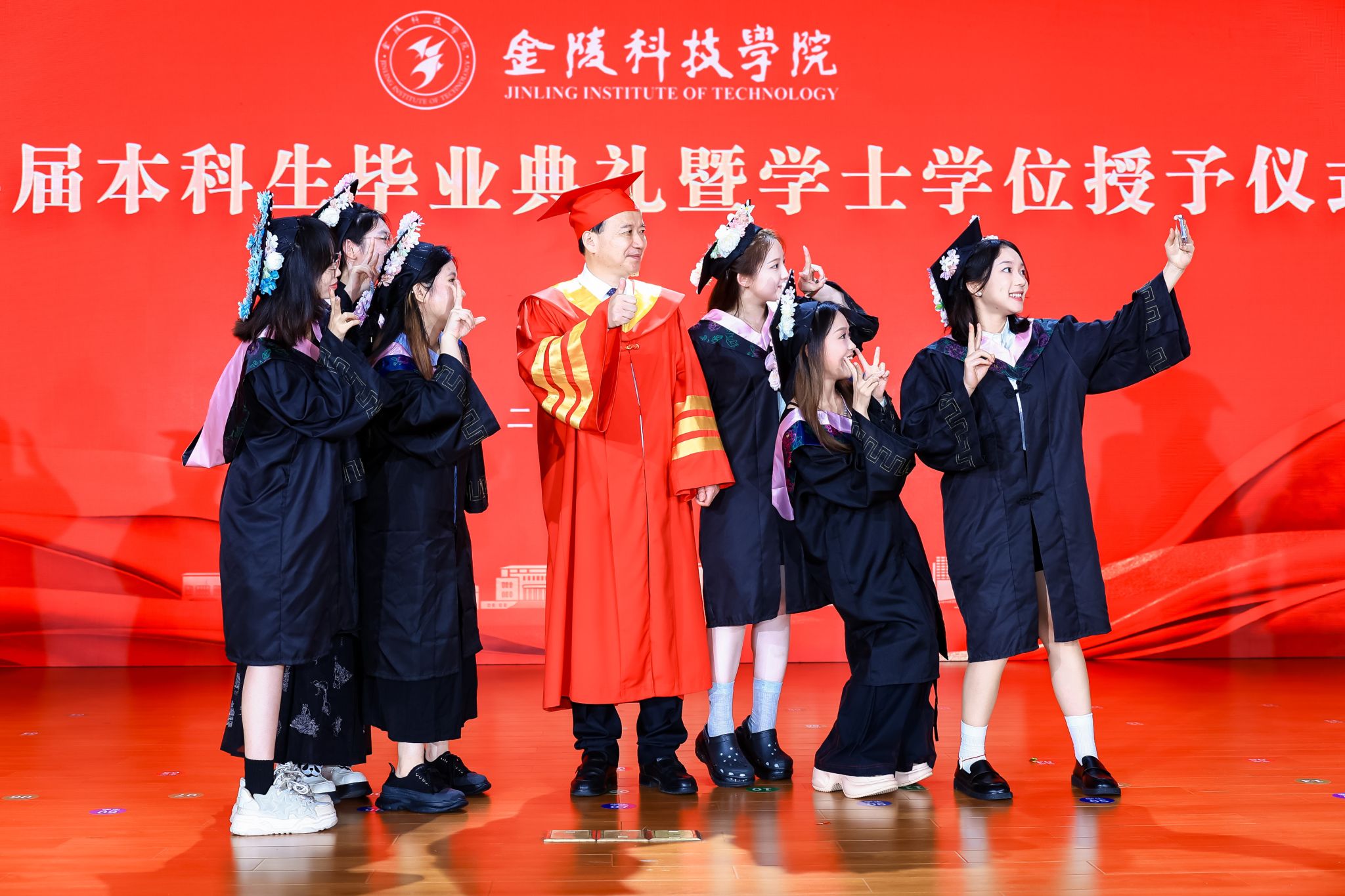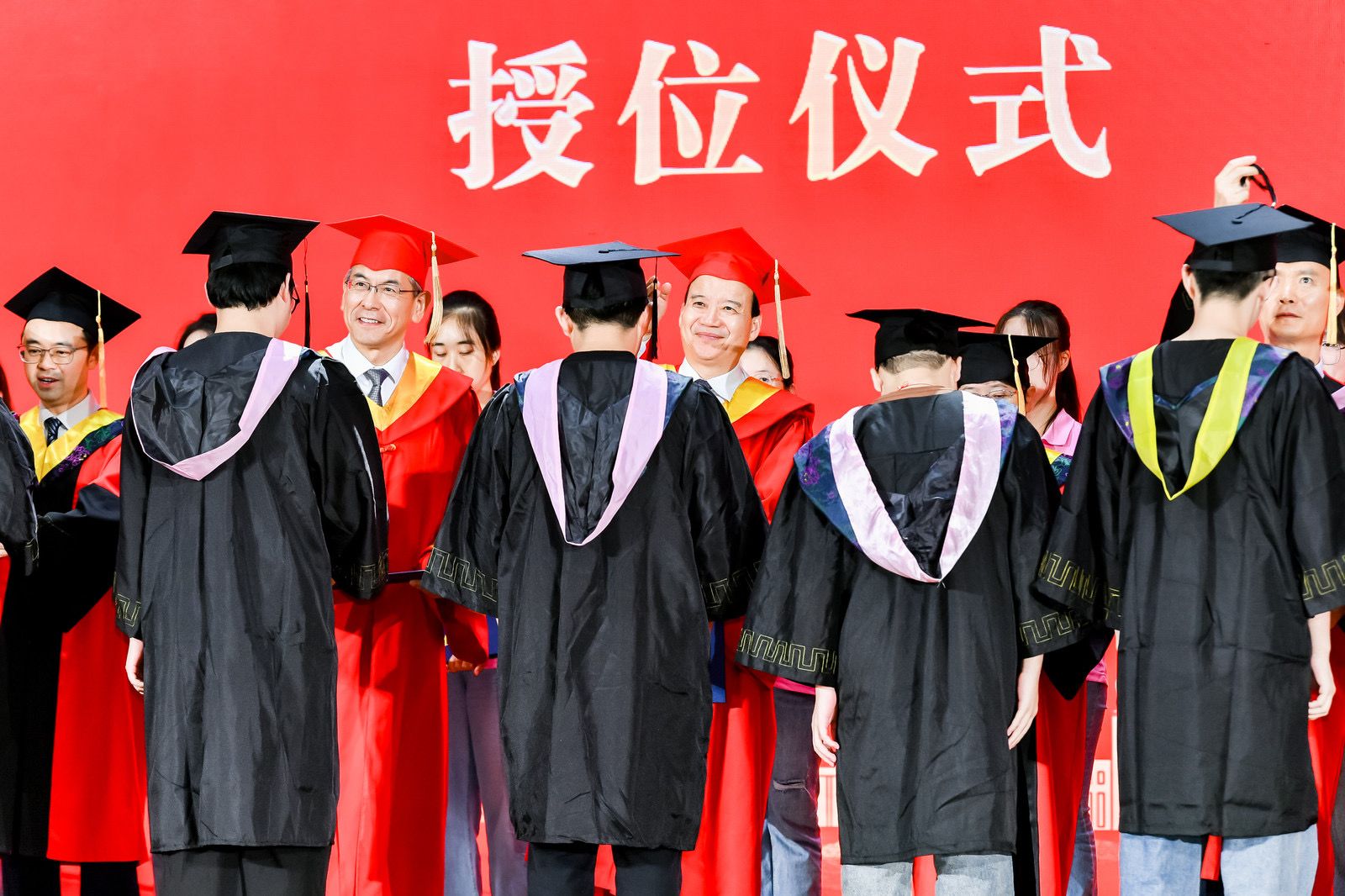 在悠扬的乐曲声中,校领导为毕业生依次拨穗正冠、颁发学位证书并合影留念,定格美好瞬间。