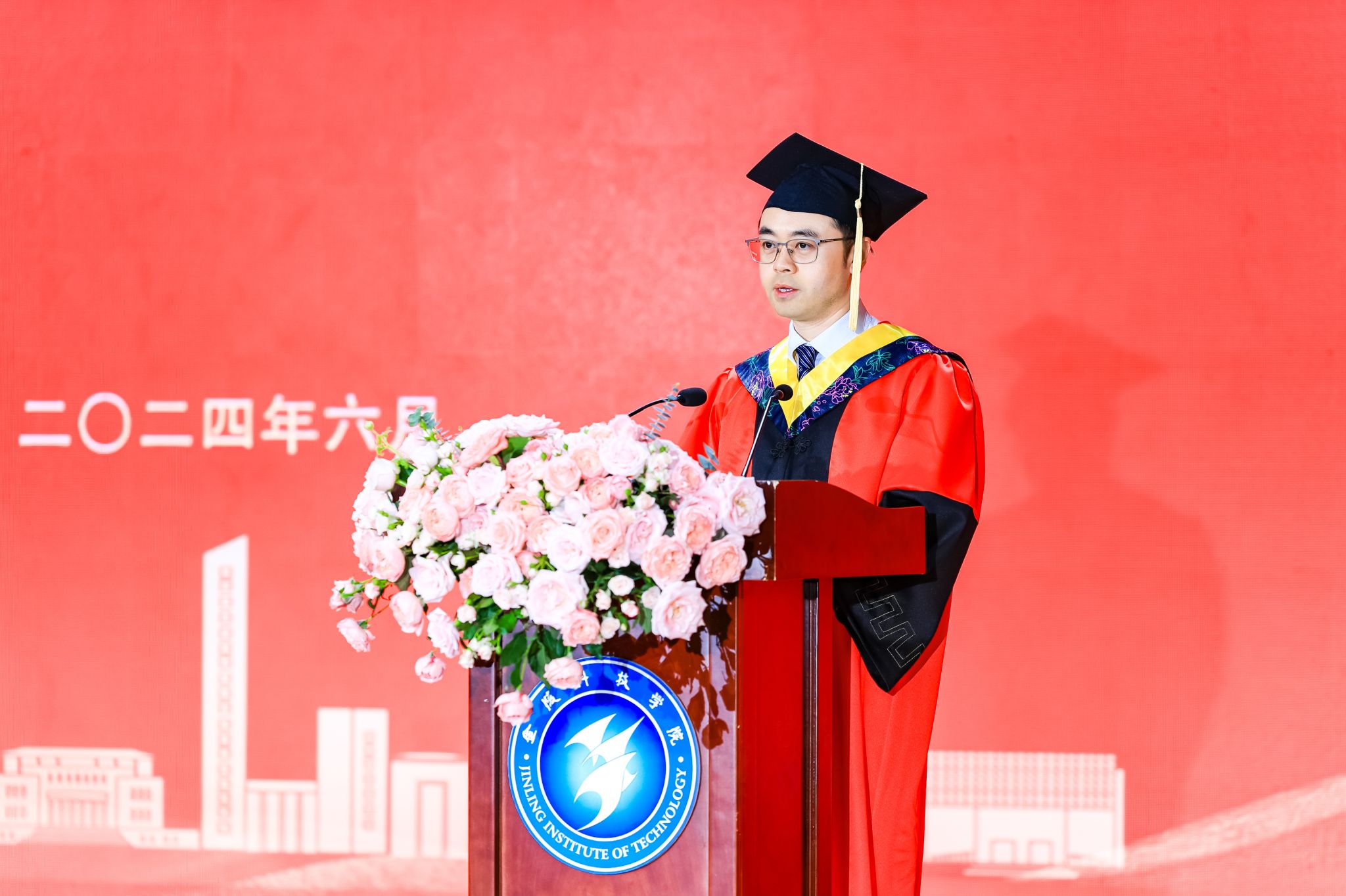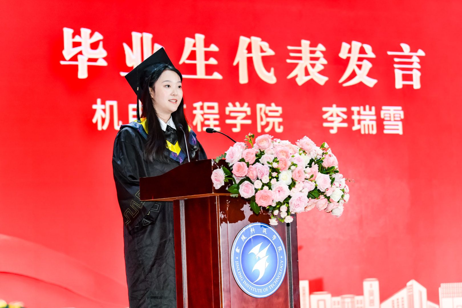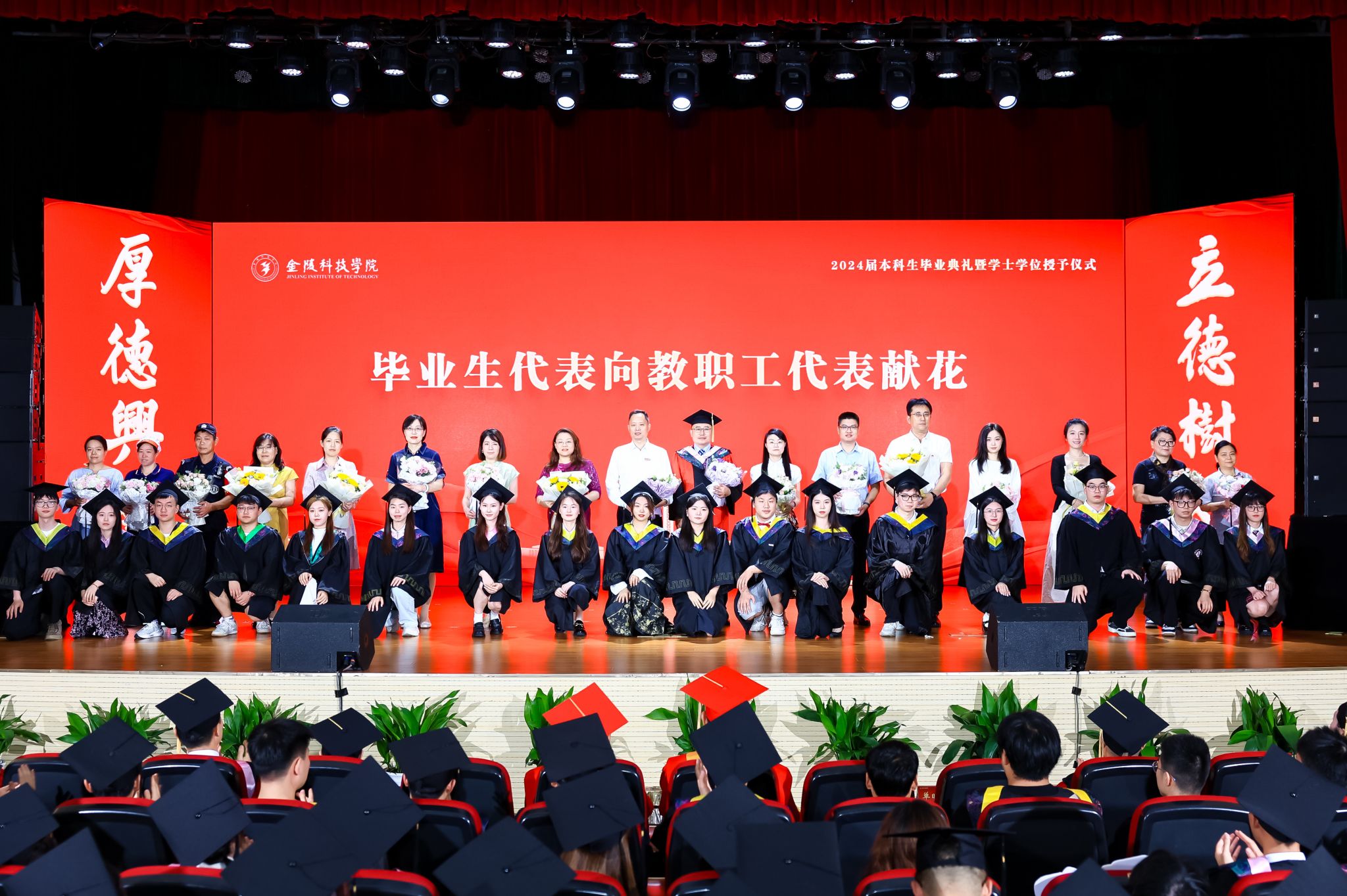 典礼现场播放了《我们的金科故事》毕业纪念视频,毕业生代表为教职员工代表献花表达感激之情。教师代表网络与通信工程学院胡琳娜教授在发言中希望毕业生们坚持学习、勇于尝试、心怀感恩。毕业生代表机电工程学院李瑞雪同学在发言中分享了大学四年的成长收获,表达了对母校的感恩与不舍。