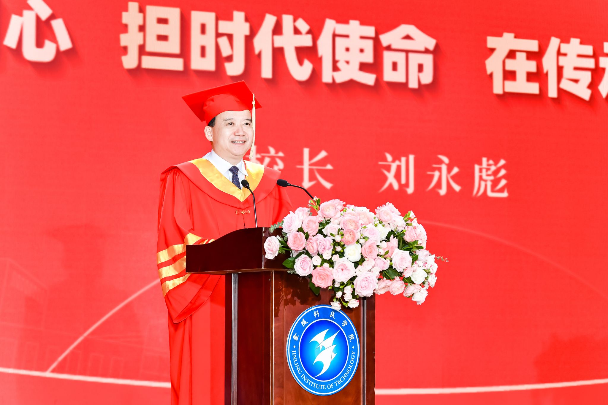 校学位评定委员会主席、校长刘永彪对圆满完成学业的毕业生表示热烈祝贺。他以《秉求知初心 担时代使命 在传承中笃志前行》为题殷切寄语毕业生,希望大家在这充满变革和机遇的时代,在强国建设、民族复兴新征程上,秉持求知初心,勇担时代使命,保持奋斗激情,敢想敢为又善作善成,用智慧和才华去创造更多的可能,让青春之花绽放在祖国最需要的地方。他将“踏实”“勇敢”“珍惜”三个关键词送给毕业生,并提出三点希望:一是在新时代里踏实走好每一步。要坚守“踏实”的品质,保持“实干”的精神,坚持从实际出发,全面提升综合素质,将理想付诸行动,脚踏实地走好每一步,依靠勤劳和汗水开辟人生和事业前程。二是在新赛道上勇敢面对每一关。要勇敢面对困难和未知,勇于担当时代赋予的历史责任,保持坚韧不拔的毅力、积极乐观的心态、努力学习的热情和锐意创新的勇气,积极探索、开拓进取,为实现中华民族伟大复兴的中国梦贡献自己的力量。三是在新征程中珍惜未来每一天。要珍惜学习和工作机会,珍惜亲情、友情和身边的人,在掌握真才实学、陶冶道德情操、增强干事创业真本领的同时,学会适当放松身心、品味美好生活,让人生在同样生命长度中绽放出数倍绚丽光彩,呈现出属于自己的独特华章。