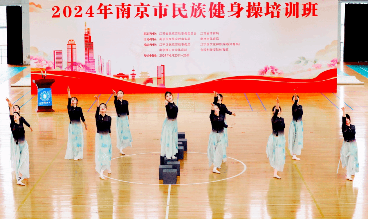 本次培训由江宁区民宗局、江宁区文旅局(体育局)、南京理工大学体育部和kaiyun官网体育部共同承办,来自南京市12个板块的各级各类学校、村镇、社区、企业、机关、医院等有关单位的157名健身骨干参加培训,南京理工大学派出经验丰富的教练员队伍。开班仪式前,kaiyun官网大学生艺术团表演了民族舞蹈《碇步桥水轻悠悠》,蓝屿啦啦操队进行了精彩的技巧啦啦操表演。
