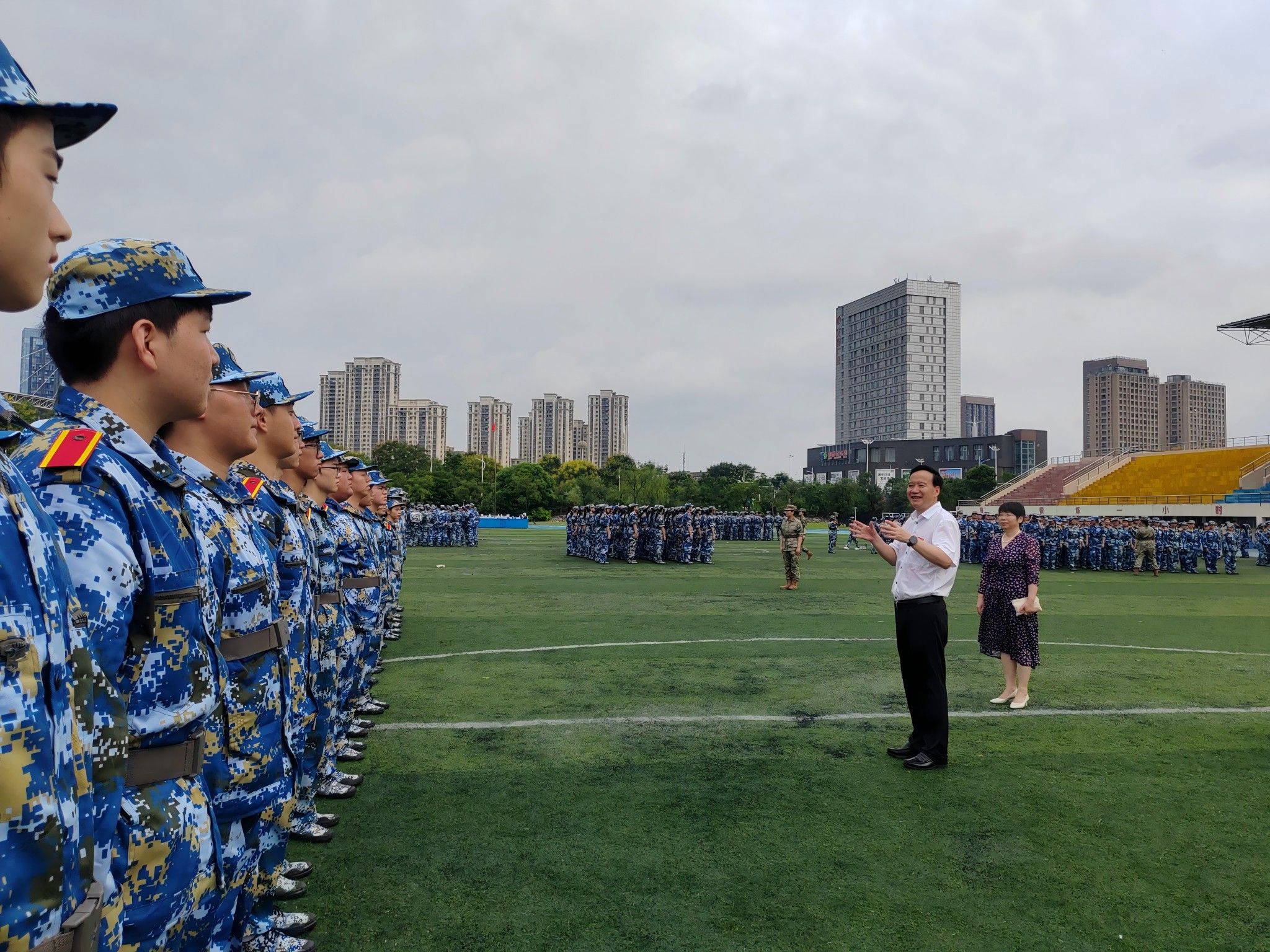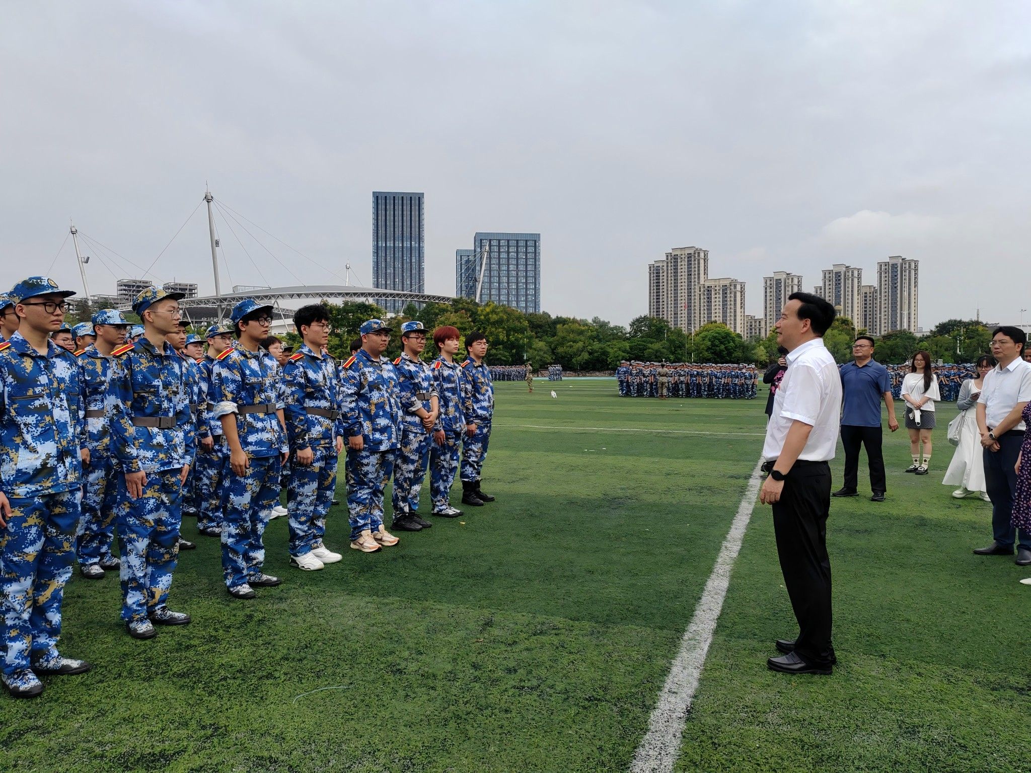 刘永彪认真观摩新生连队队列训练,代表学校向全体现役部队教官、退役学生教官和带训辅导员表示感谢,对参训学生表示慰问,并向大家致以节日问候。他指出,今天是台风过境后第一天,恰逢中秋佳节,校园全面恢复秩序,同学们坚持训练,展现了全校师生积极向上的精神风貌。他向全体参训学生提出三点希望:一是高度重视,学好军训这一大学生涯“第一课”,不断强化国防意识和报国志向;二是科学参训,在合理作息饮食和适训身体条件基础上,圆满完成训练任务;三是锤炼意志,传承部队优良作风,让训练成果体现在平时学习工作生活方方面面。