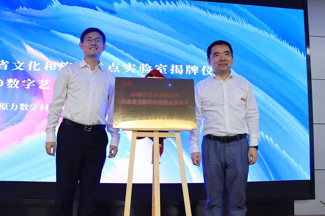 会上,动漫学院院长王贤波、江苏原力数字科技股份有限公司高级副总裁董自亭为江苏省文化和旅游“3D数字艺术呈现技术重点实验室”揭牌。