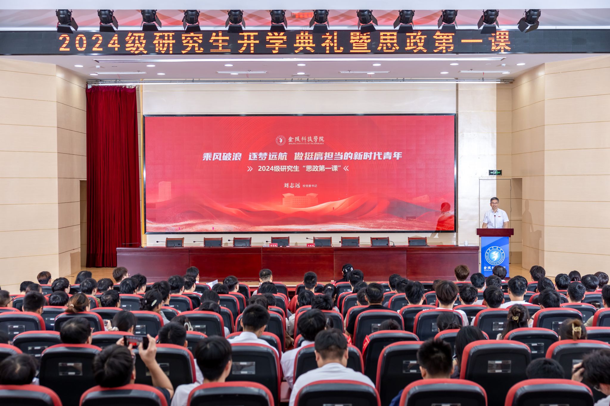 刘志远以《乘风破浪 逐梦远航 做挺膺担当的新时代青年》为题,从金科校史出发,激励新生传承好金科人“艰苦奋斗、敢想敢做、开拓创新、勇于奉献”的精神。他立足时代背景,鼓励新生坚定方向、勇担使命,在服务现代化强国建设的进程中实现人生价值;通过“二十英里法则”,勉励新生明确目标、合理规划、勇于实践;通过分析人工智能AI工具的“双刃剑”效应,提醒新生在遵守学术规范道德的前提下,正确合理使用AI工具,提高学习效率。
