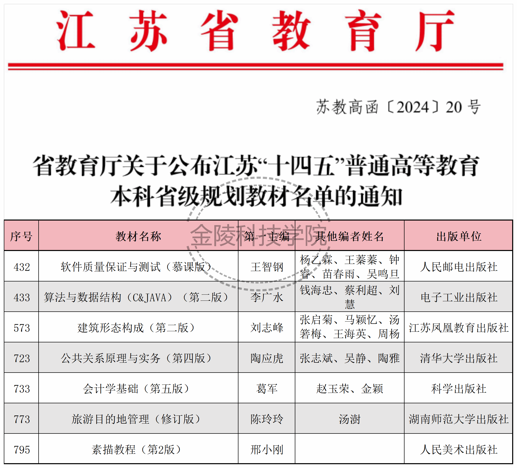 近日,江苏省教育厅发布《省教育厅关于公布江苏“十四五”普通高等教育本科省级规划教材名单的通知》(苏教高函〔2024〕20号),kaiyun官网《软件质量保证与测试(慕课版)》《算法与数据结构(C&JAVA)(第二版)》《建筑形态构成(第二版)》《公共关系原理与实务(第四版)》《会计学基础(第五版)》《旅游目的地管理(修订版)》《素描教程(第2版)》等7部教材获批为江苏“十四五”普通高等教育本科省级规划教材。