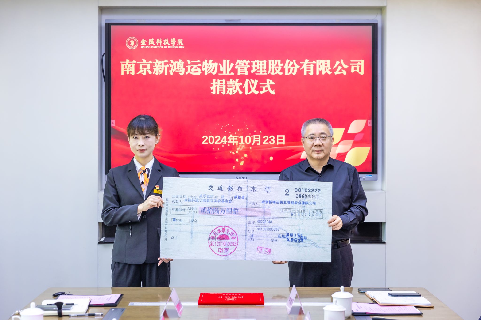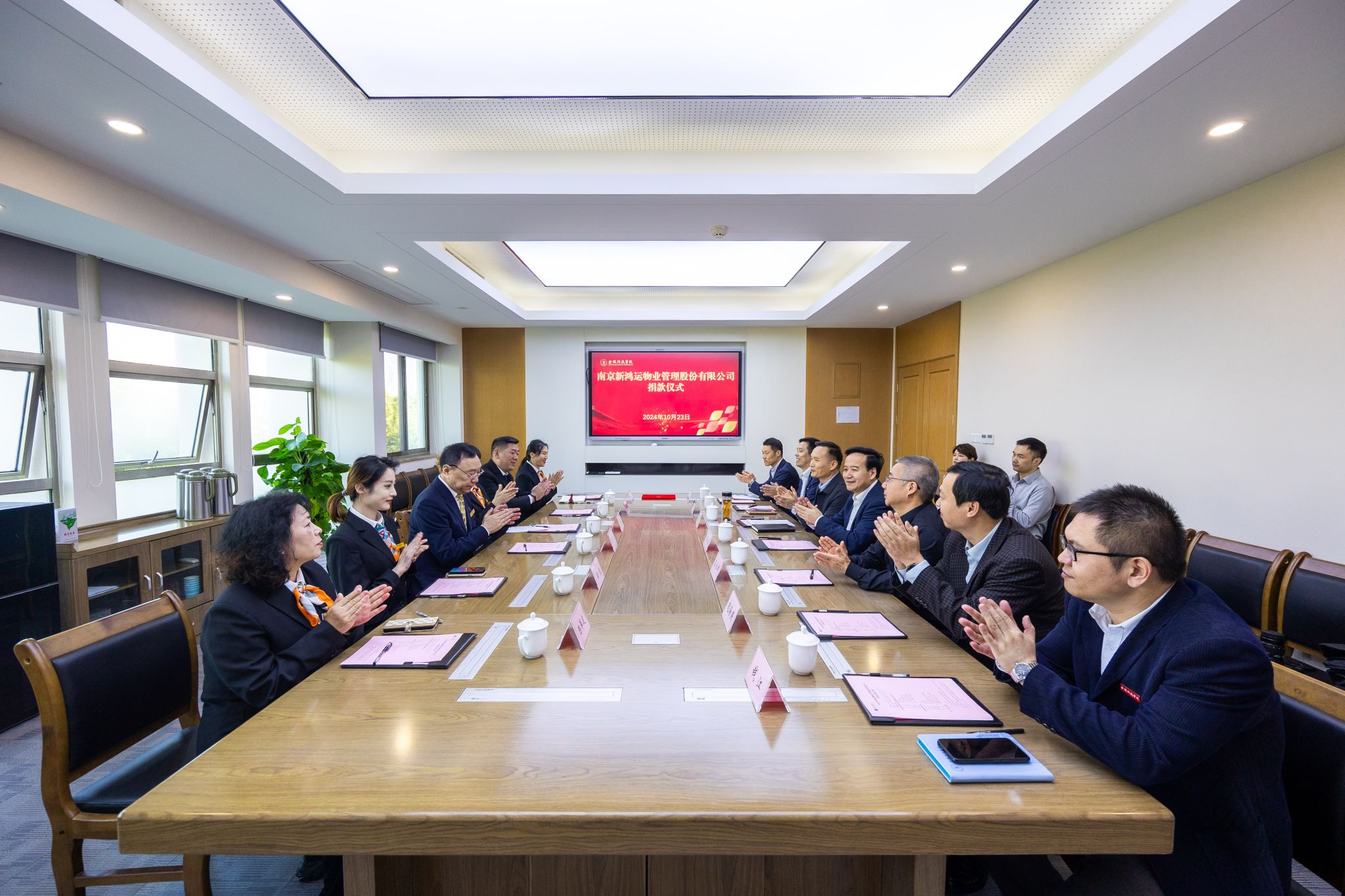 刘永彪向新鸿运公司连续四年对学校教育事业的大力支持和慷慨捐赠表示衷心感谢。他表示,学校将切实做好捐赠资金的使用规划,把企业捐款用到实处。他希望新鸿运公司坚持以优化校园物业服务为导向,继续助力学校工作,为学校高质量发展提供优质后勤保障。