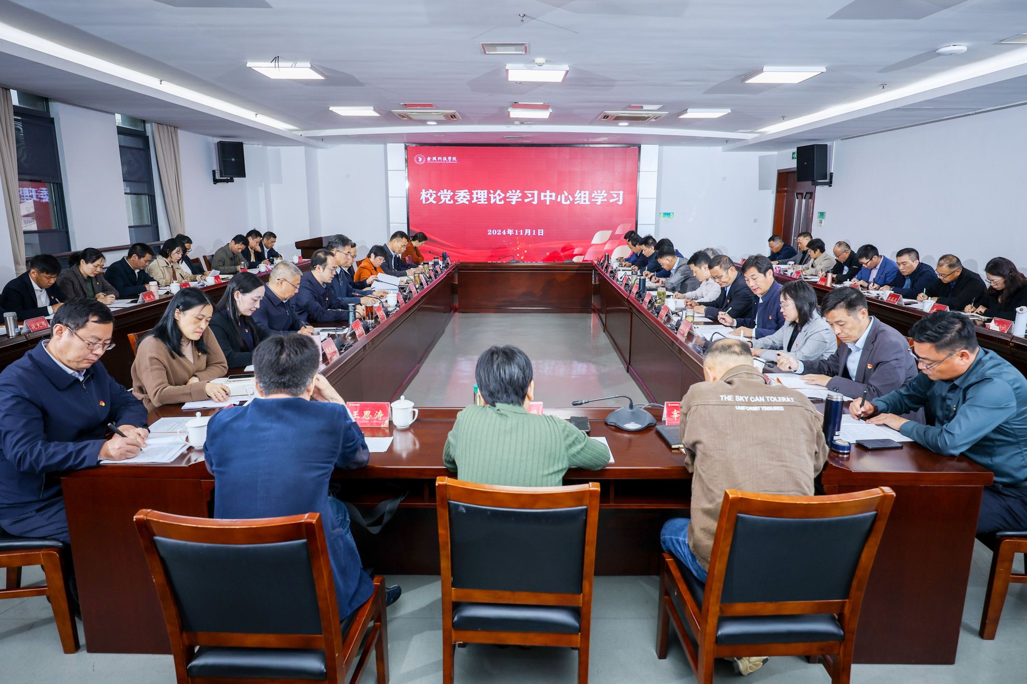 11月1日,校党委理论学习中心组在图书馆第一报告厅集体学习研讨党的二十届三中全会精神,推动全会精神在全校落地生根。校党委书记刘志远主持会议并讲话,全体校领导、校党委委员、校纪委委员、二级党组织书记、党群部门主要负责人参加会议。