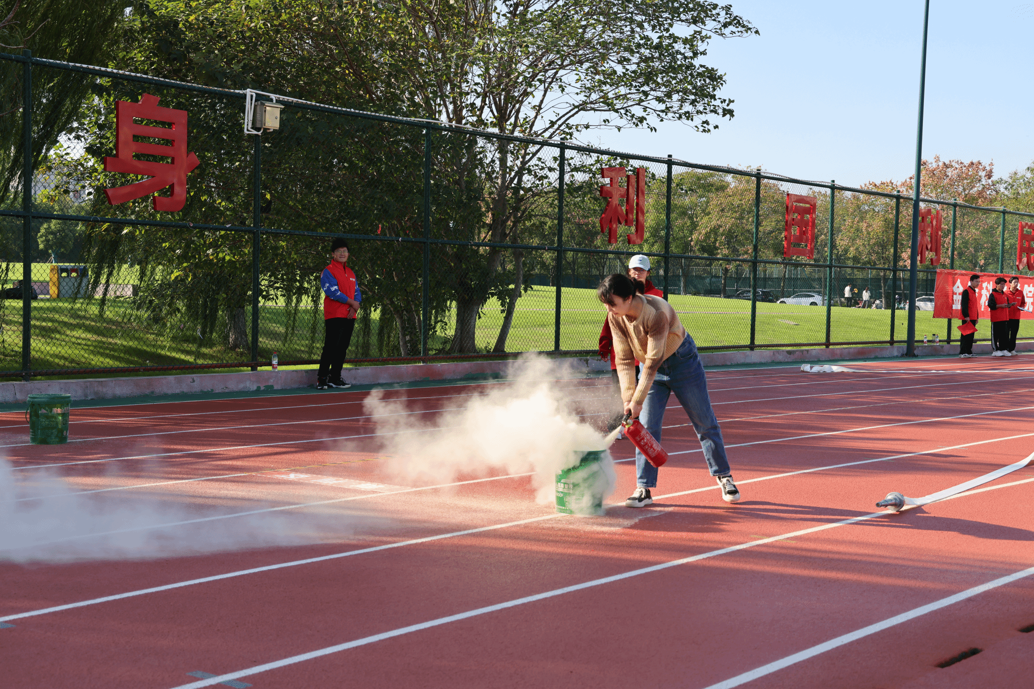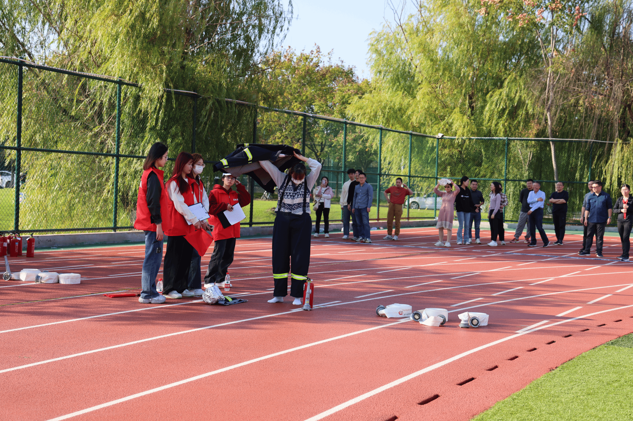 随着副校长顾晓燕宣布比赛开始,校第三届“安康杯”教职工消防趣味运动会正式拉开序幕。本届运动会由校工会和保卫处联合举办,共有22支分工会代表队同场竞技。为使参赛队员熟知比赛流程和具体操作要求,保卫处、工会在赛前专门组织了培训,并录制比赛规范操作视频供大家学习。全体裁判人员由经过消防专项培训的学生义务消防队队员担任。