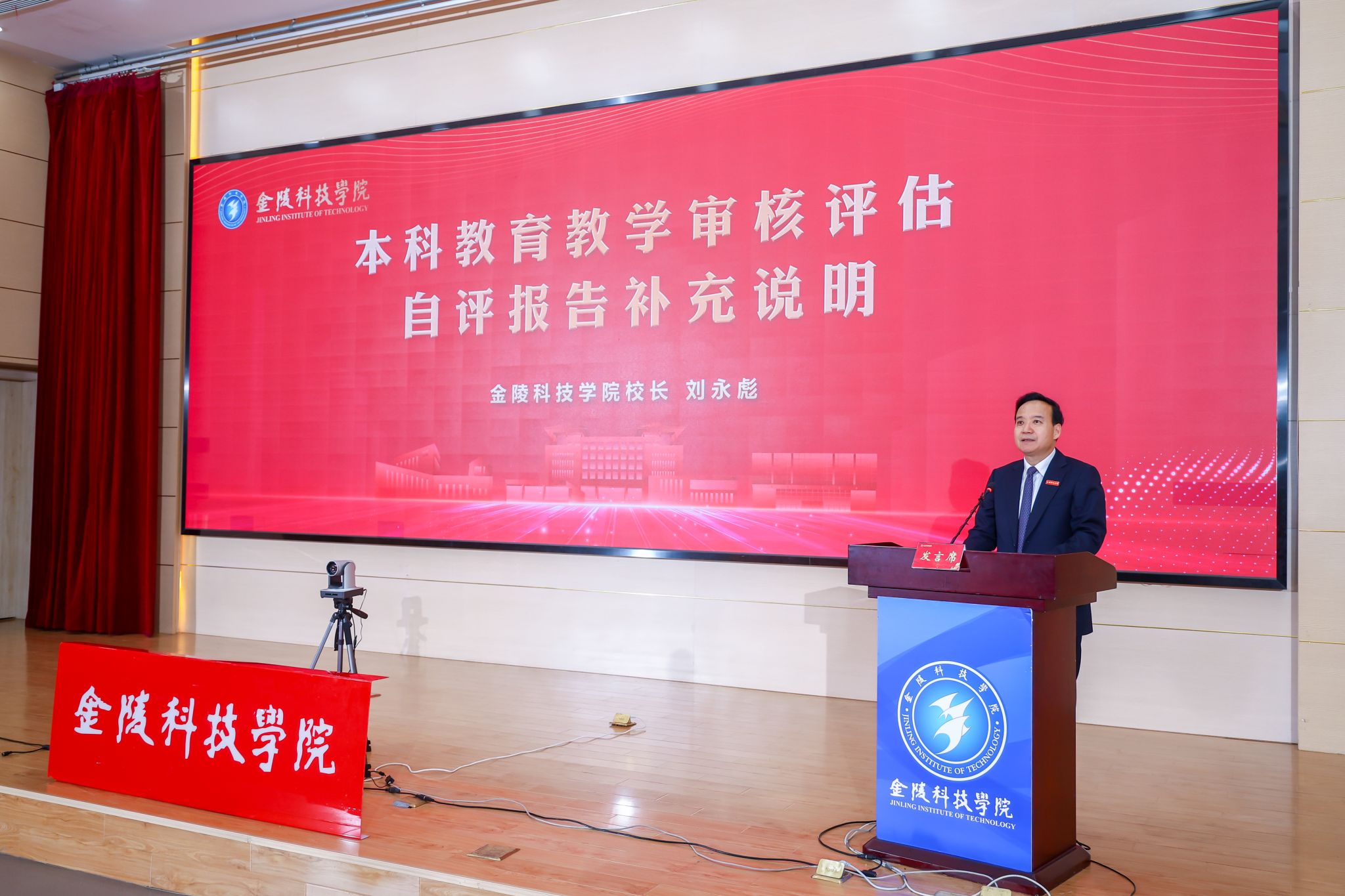 校长刘永彪就本科教育教学审核评估自评报告从学校发展历程、自评自建、办学特色三方面做了补充说明。他指出,长期以来,在省委省政府、市委市政府和上级教育主管部门的正确领导与大力支持下,学校将党的建设与学校事业发展同研究、同部署、同落实,各项事业稳中快进,取得了长足发展。他强调,在迎接新一轮审核评估期间,学校按照教育部和江苏省评估实施方案要求,积极开展自评自建,一体推动评估建设与日常工作,注重先谋快动、加强统筹协调、强化培训提能、重视氛围营造,扎实推进本科教育教学工作再上新台阶。他还从“立足南京,打造‘大思政’实践课堂”“五育并举,促进学生全面发展”“产教融合,开创校行企协同新局面”“六地为要,人才培养服务城市发展”“融宁兴农,农科教讲师团助力乡村振兴”“数字赋能,推动教育教学智慧转型”六个方面介绍了学校的办学特色。