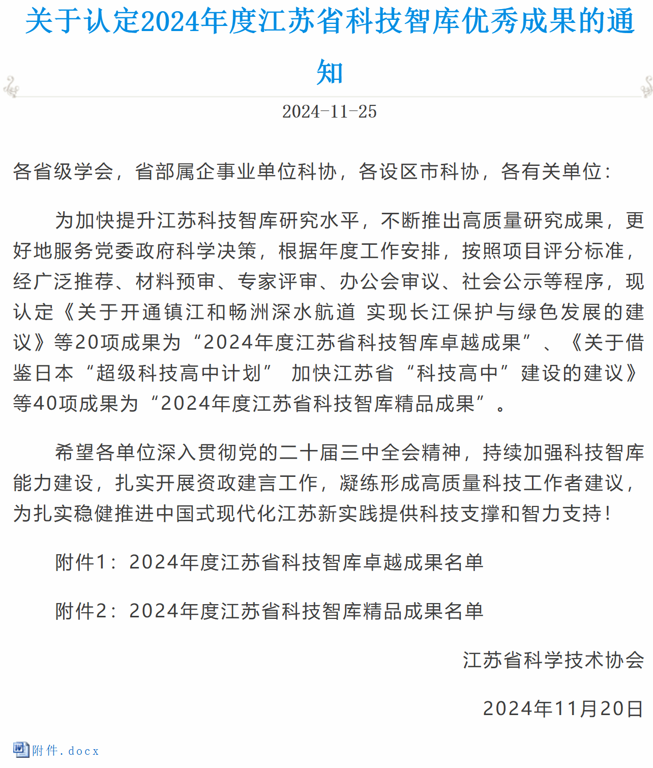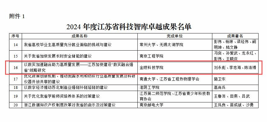 11月20日,江苏省科学技术协会发布《关于认定2024年度江苏省科技智库优秀成果的通知》。kaiyun官网刘永彪教授、李忠海副教授、陈浩博博士撰写的《以数实加速融合助力高质量发展——江苏加快建设“数实融合强省”战略研究》决策咨询报告,被认定为“2024年度江苏省科技智库卓越成果(省一等奖)”。这既是kaiyun官网首次获评江苏省科技智库卓越成果奖项,也是kaiyun官网数字经济团队组建以来第六次获评省、市级优秀智库成果奖项。此次评选活动在全省范围内开展,经广泛推荐、材料预审、专家评审、办公会审议等环节,最终认定60项优秀成果。其中,卓越成果20项、精品成果40项。