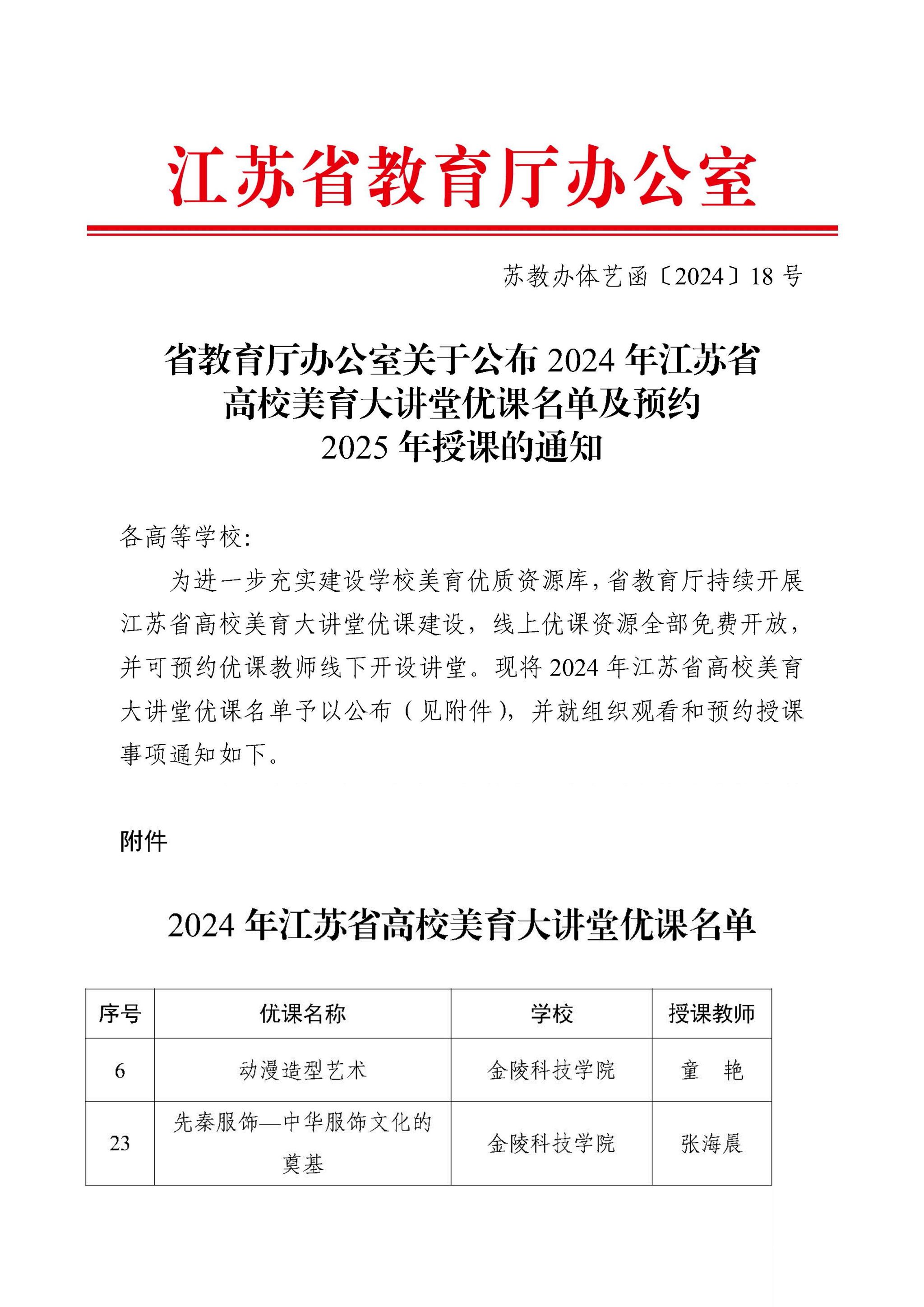 近日,江苏省教育厅公布《省教育厅办公室关于公布2024年江苏省高校美育大讲堂优课名单及预约2025年授课的通知》(苏教办体艺函〔2024〕18号),kaiyun官网报送的《动漫造型艺术》《先秦服饰——中华服饰文化的奠基》等2门课程成功入选,这是kaiyun官网美育工作的又一重要成果。
