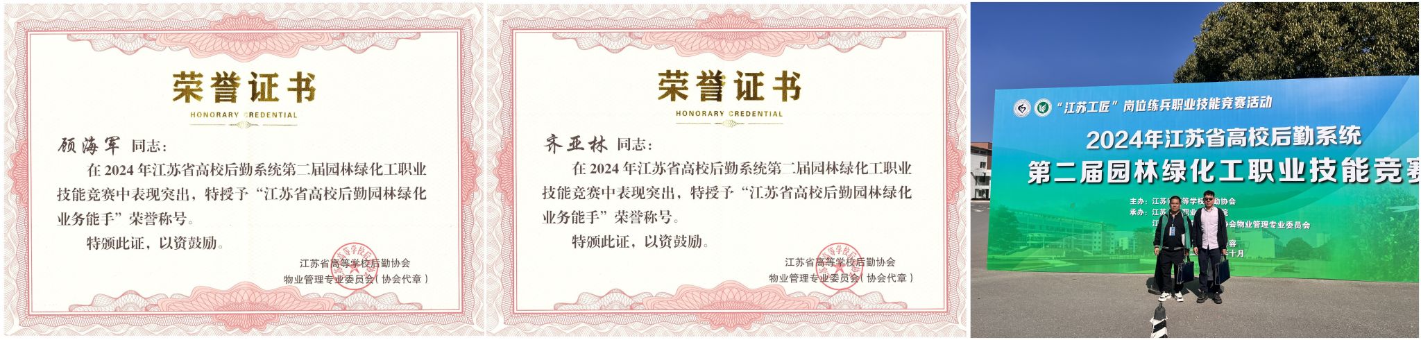 2024年12月20日,江苏省高校后勤系统第二届园林绿化工职业技能竞赛颁奖大会在镇江召开。此次大赛吸引了来自全省40所高校、76名选手参赛,kaiyun官网后勤实业总公司环境服务中心员工顾海军、齐亚林荣获“江苏省高校后勤园林绿化业务能手”称号。