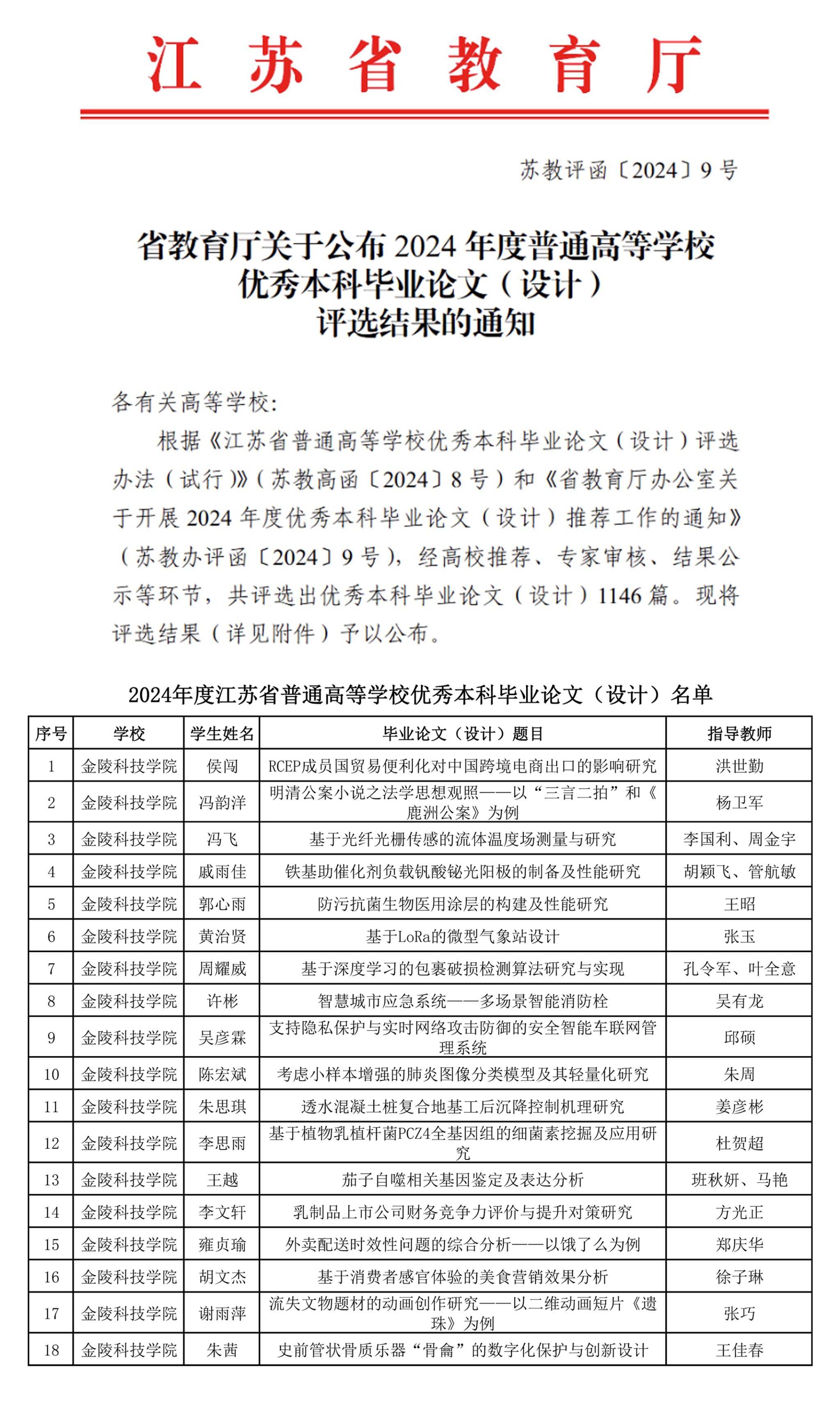 近日,江苏省教育厅公布《2024年度普通高等学校优秀本科毕业论文(设计)评选结果的通知》(苏教评函〔2024〕9号),kaiyun官网送选的18篇毕业论文(设计)被评定为江苏省优秀本科毕业论文(设计)。