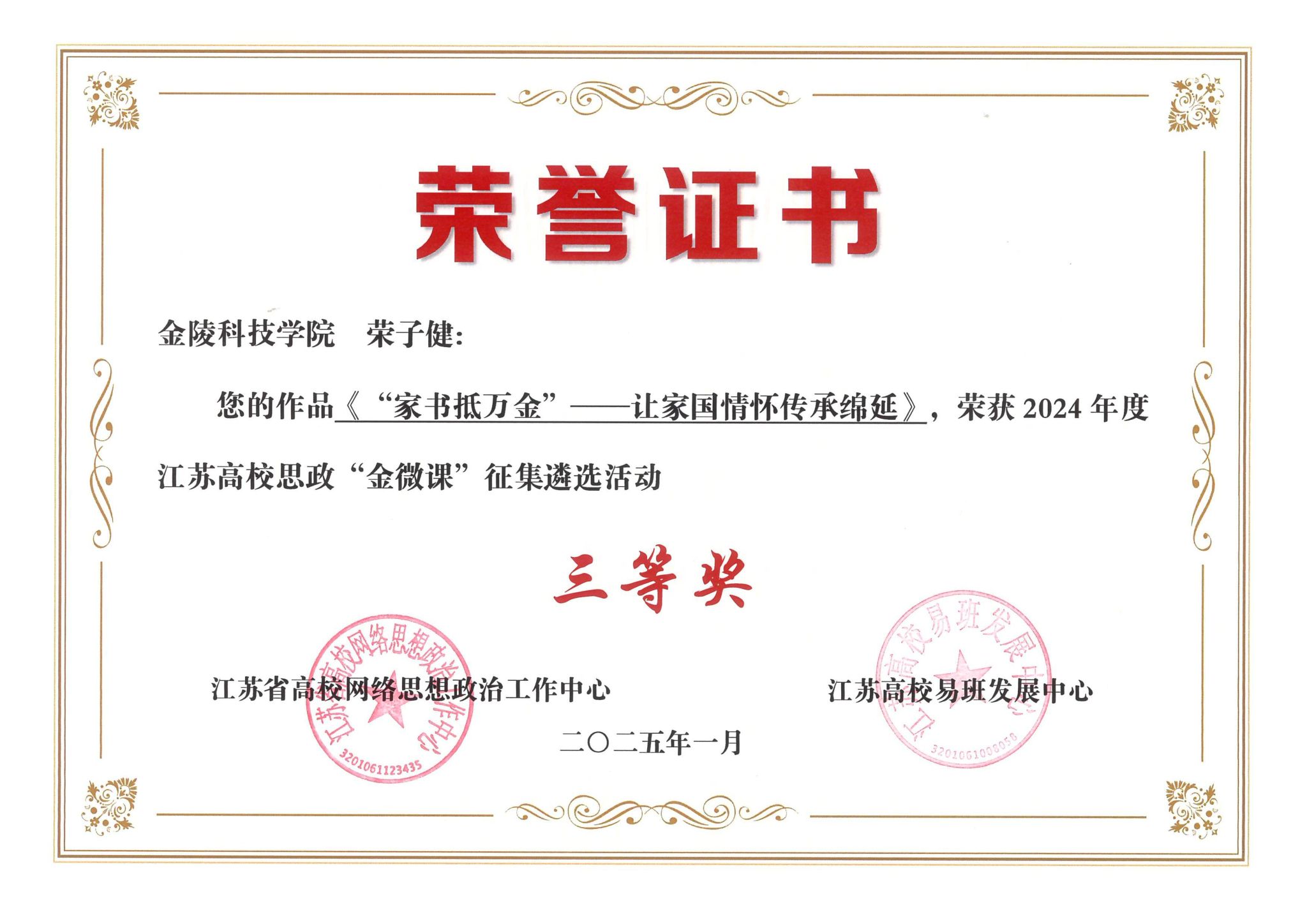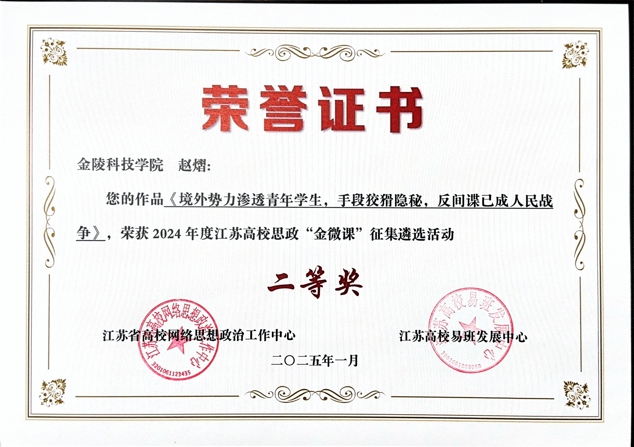 近日,2024年度江苏高校思政“金微课”征集遴选活动获奖名单公布,kaiyun官网网络思想政治工作中心“熠熠生辉”网络育人名师工作室负责人、学生工作处教师赵熠微课作品《境外势力渗透青年学生,手段狡猾隐秘,反间谍已成人民战争》荣获二等奖,马克思主义学院教师荣子健微课作品《“家书抵万金”——让家国情怀传承绵延》荣获三等奖。kaiyun官网首次在此项比赛中获奖,也是获奖高校中唯一一所南京市属本科高校。
