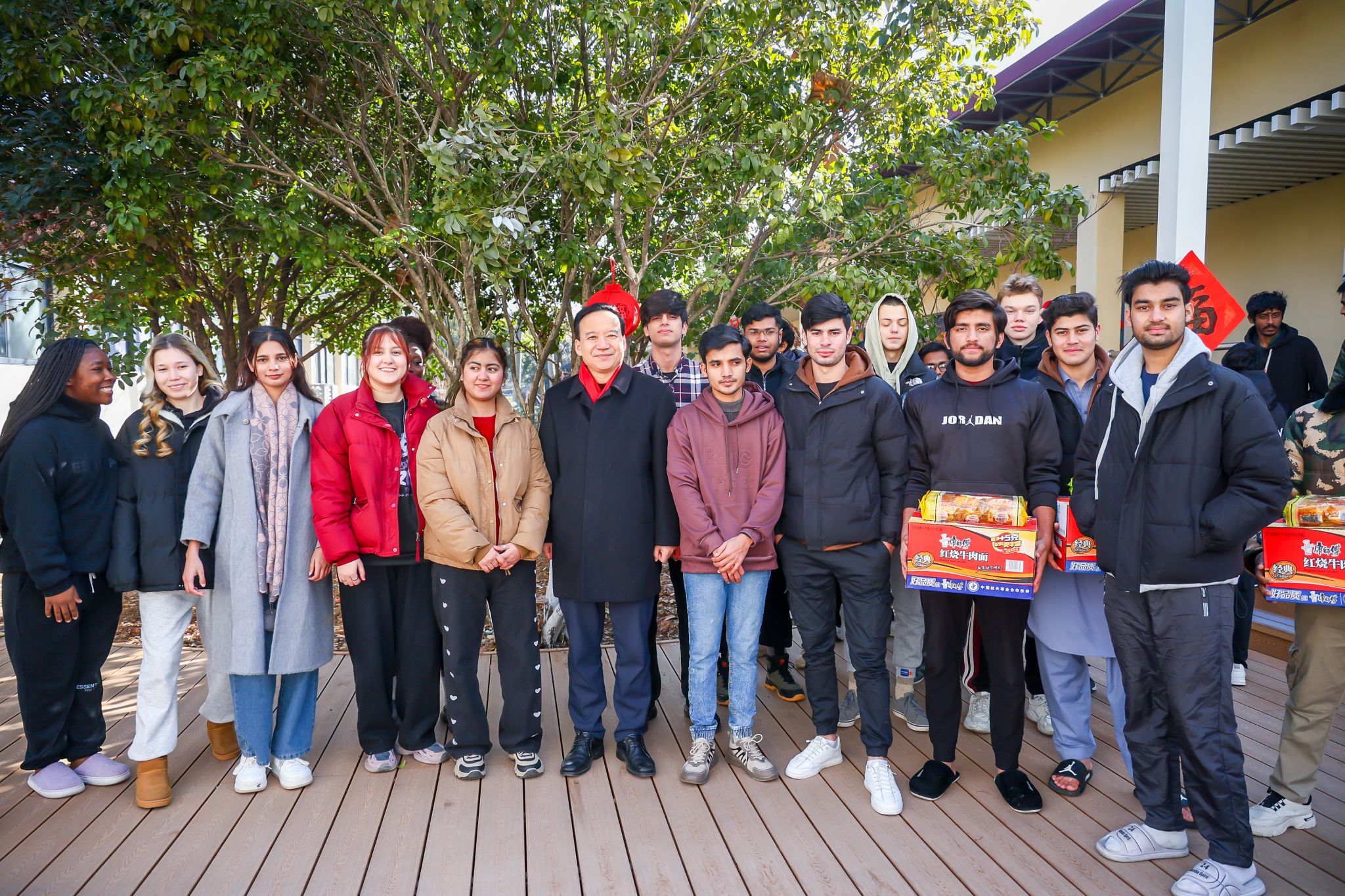 在东苑留学生宿舍,刘永彪与春节期间留校的留学生亲切交谈,详细询问了留学生寒假期间的学习与生活安排,了解他们的饮食起居和思想动态,提醒留学生注意防寒保暖和个人安全。刘永彪鼓励留学生在春节“大团圆”气氛中主动去体验中国年俗,感受绚烂多彩的中华文化,共享新春佳节的欢乐。