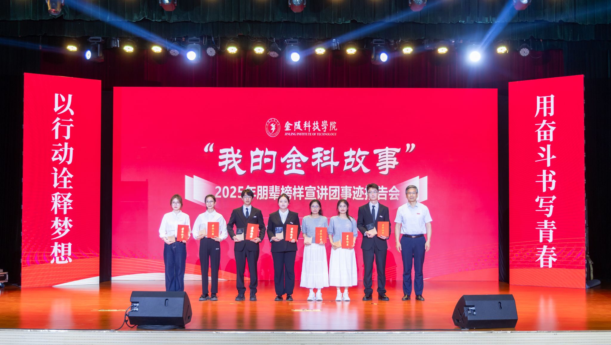报告会现场,观众通过两段视频回顾了历年朋辈榜样宣讲会的活动剪影,并共同观看了《金科榜样成长档案》。6组7位来自不同学院的朋辈宣讲团成员用质朴的语言讲述奋斗故事。建筑工程学院双胞胎姊妹卜晓露、卜晓雅的成长故事拉开活动序幕,入学一年半双双竞选成为学生会骨干,更以绩点第一的成绩领跑专业,斩获国家励志奖学金等荣誉;软件工程学院陈嘉伟作为2024年“高校雨花英烈事迹与精神宣讲团”团长,从红色文化学习者成长为革命精神的讲解、传承与践行者;动漫学院肖静带领团队打造金科“云端校园”打卡地图,在校园服务中定义专业价值;网络安全学院刘家硕以一名平凡大学生视角,沉浸式讲述普通同学也可以通过主动沟通、技术深耕等方式完成从迷茫新生到技术守护者的蜕变;动物科学与食品工程学院史铭瑜以在校大学生的身份成为长江江豚科普讲师,写下“长江大保护”的青年答卷;材料工程学院张帆用专业科普消除公众信息偏差,主持的创新创业项目《打破信息壁垒,建立人工宝石科普平台》入选国家级创业项目……这些新时代青年以“实践”为琴、执“担当”为弦,谱下昂扬的时代强音,正如会场两侧悬挂的标语所昭示:“让优秀成为一种习惯,让传承成为一种力量”。
