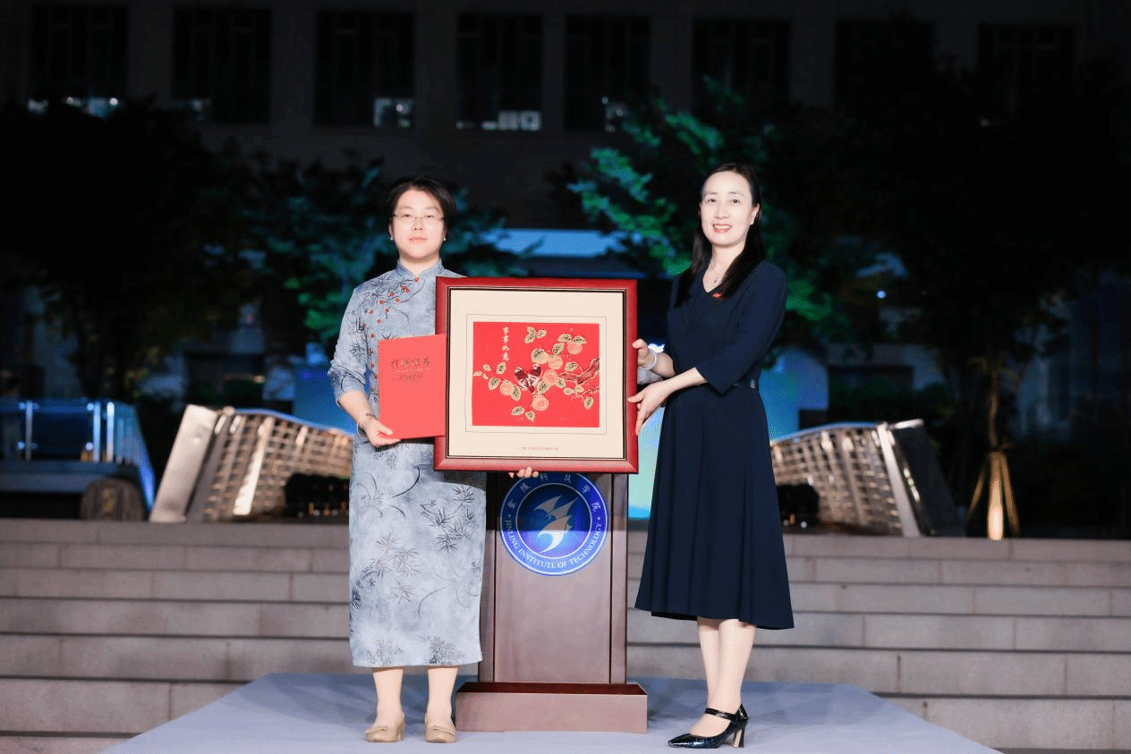 校友陈林捐赠云锦作品《事事如意》,顾晓燕向其颁发捐赠证书。
