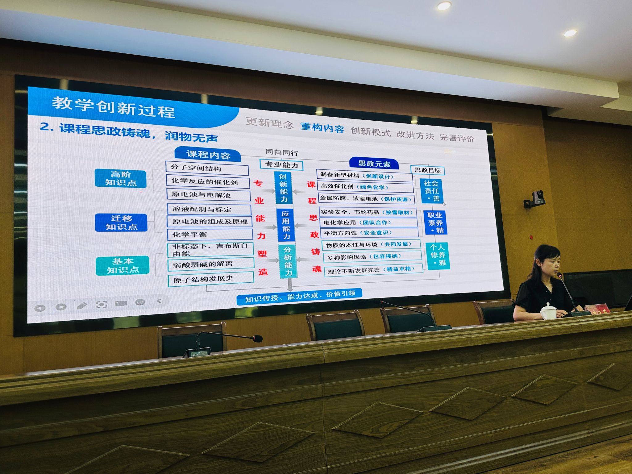 朱庆莉结合参加首届省教创赛的经历,以《工程化学》课程为例,阐述了教学创新的思路、举措、成效,分享了备赛细节和参赛心得,为参会教师提供了有益参考。朱庆莉强调了选择课程、注重积累、提炼创新点的重要性,建议教师们结合教学实践深入分析,找准问题,思考对策,把握教学创新成果报告和课堂教学实录视频之间的关联性,以形成教学创新体系闭环。