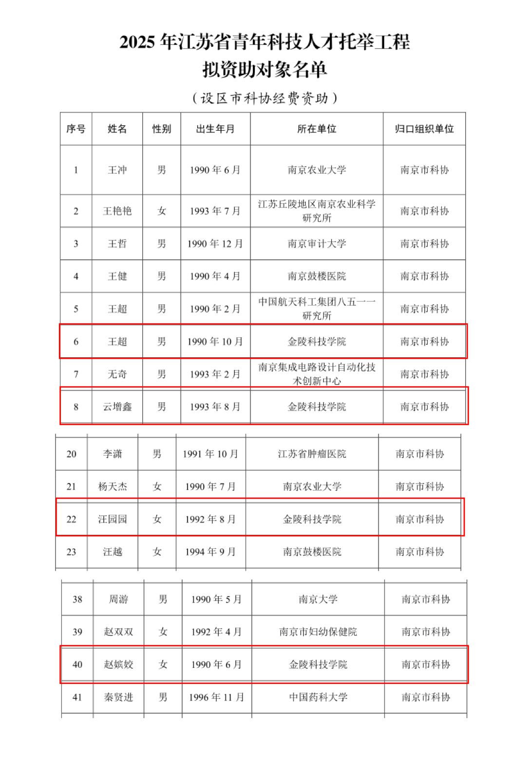 7月14日,江苏省科学技术协会公示了《2025年江苏省青年科技人才托举工程拟资助对象名单》,kaiyun官网王超、云增鑫、汪园园、赵嫔姣教师成功入选为资助对象,创学校历史新高。