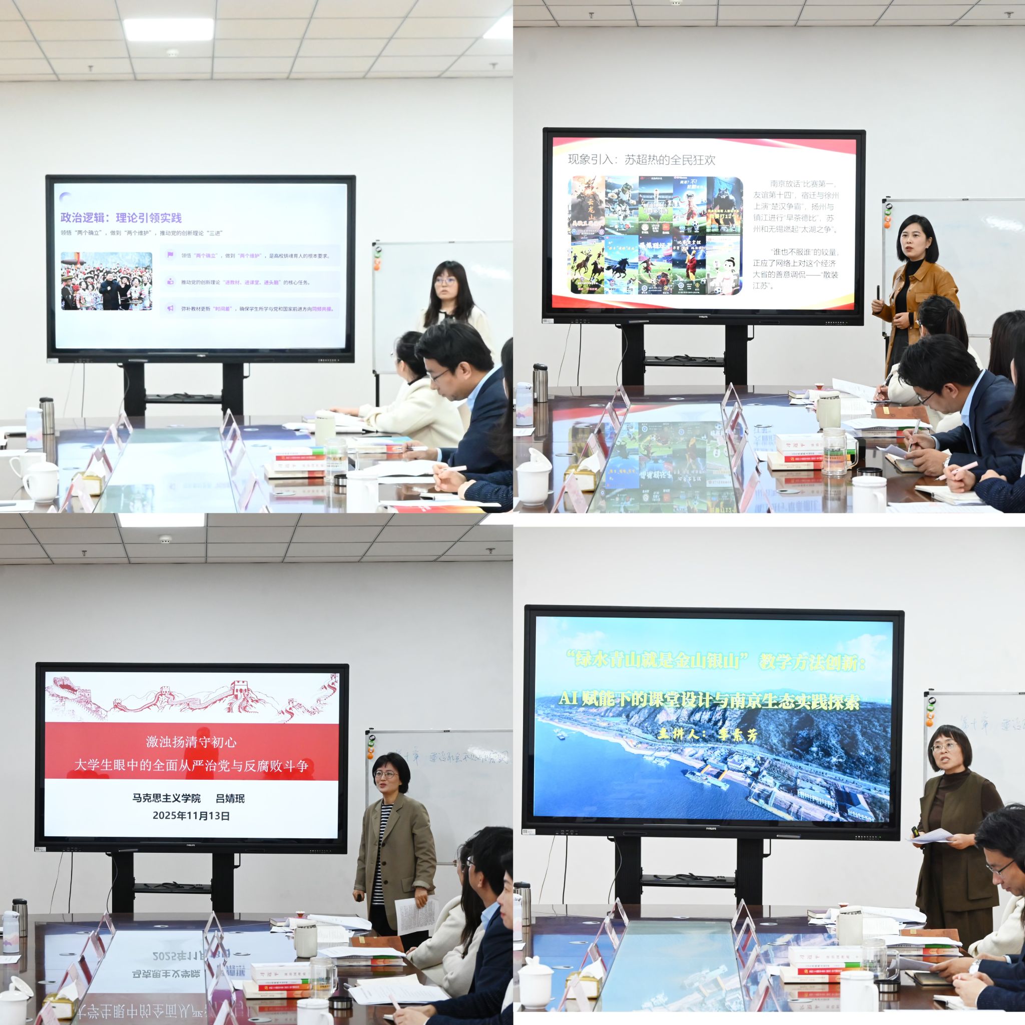备课会上,马克思主义学院副院长刘霆介绍了本次集体备课会的背景和目的,表示备课会旨在凝聚集体智慧,共同探索更符合学生认知规律、更具吸引力的教学方法与模式,推动思政课教学高质量发展。习近平新时代中国特色社会主义思想概论教研室副主任李美娴介绍了《习近平谈治国理政》第五卷与党的二十届四中全会精神融入课程的实施路径,从“为何融、融什么、怎么融”三个维度作了汇报。荣子健、吕婧珉、李素芳等三位教师结合自身教学经验,依次分享了教学过程中遇到的挑战与困惑,并提出了相应解决方案。