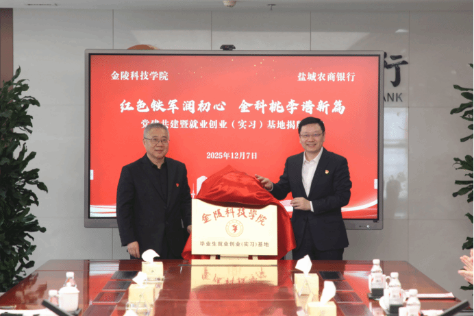 盐城农商银行党委书记、董事长许闯与校党委常委、副校长高永祥共同为就业创业(实习)基地揭牌