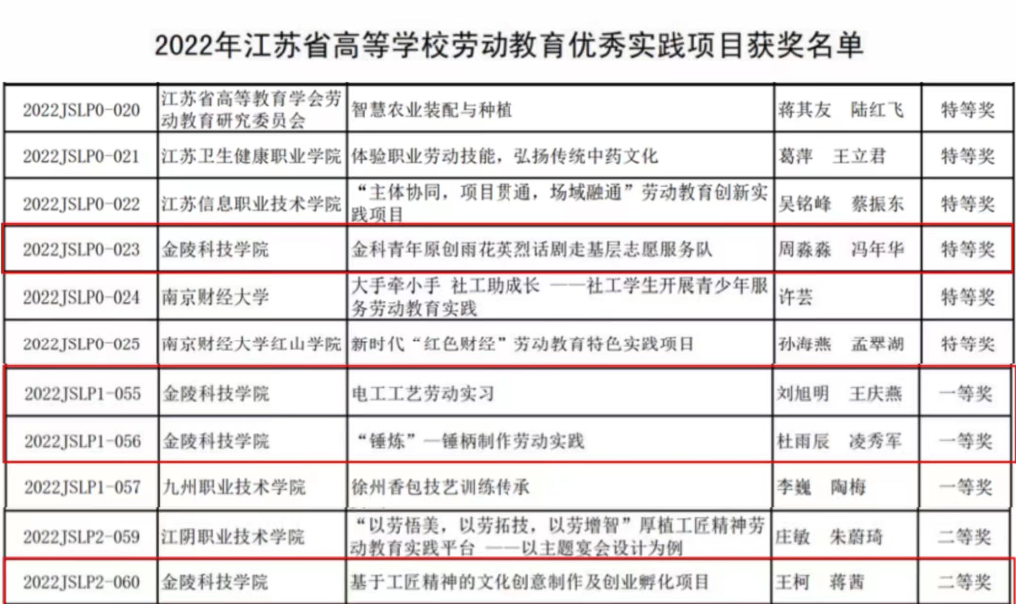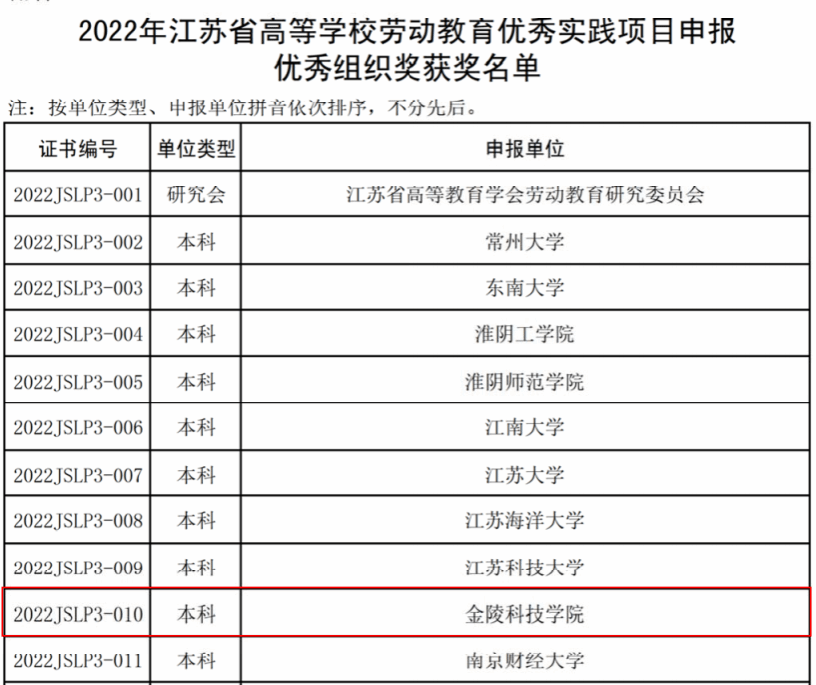 根据《关于公布2022年江苏省高等学校劳动教育优秀实践项目评选结果的通知》(苏高教会﹝2023﹞5号)文件,kaiyun官网择优报送的4个项目全部获奖,其中特等奖1个、一等奖2个、二等奖1个。由于项目评选组织规范、成绩优异,学校同时被授予“优秀组织奖”。