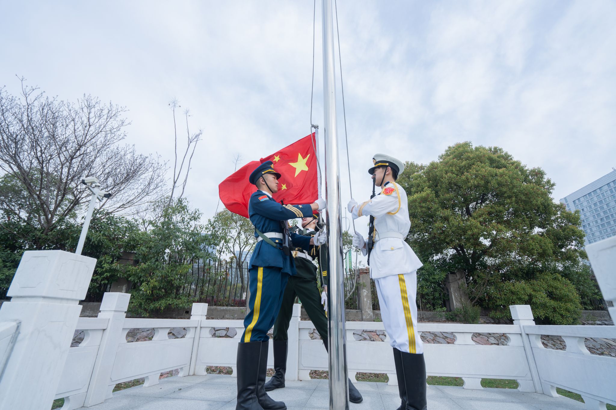 “升国旗,奏唱国歌!”随着指挥员的口令,雄壮的《义勇军进行曲》奏响,擎旗手奋力将国旗抛向天空,鲜艳的五星红旗在嘹亮的国歌声中冉冉升起。