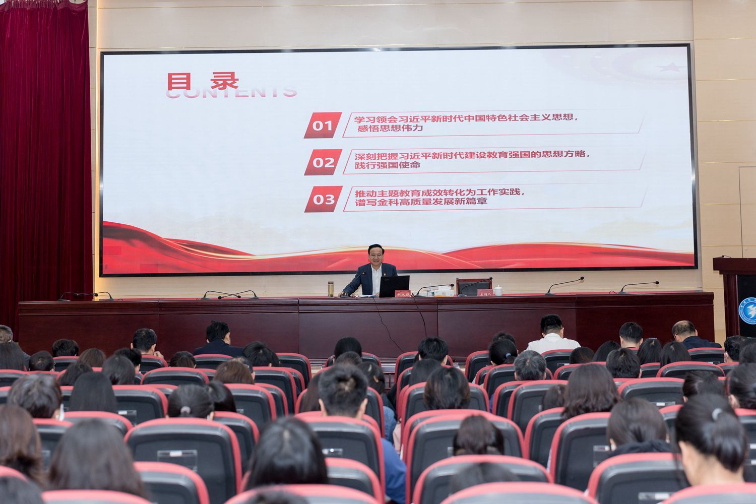 刘永彪以《感悟思想伟力 践行强国使命——谱写金科高质量发展新篇章》为题,从学习领会习近平新时代中国特色社会主义思想,感悟思想伟力;深刻把握习近平新时代建设教育强国的思想方略,践行强国使命;推动主题教育成效转化为工作实践,谱写金科高质量发展新篇章三个方面,联系工作实际,讲授了一堂生动的党课。