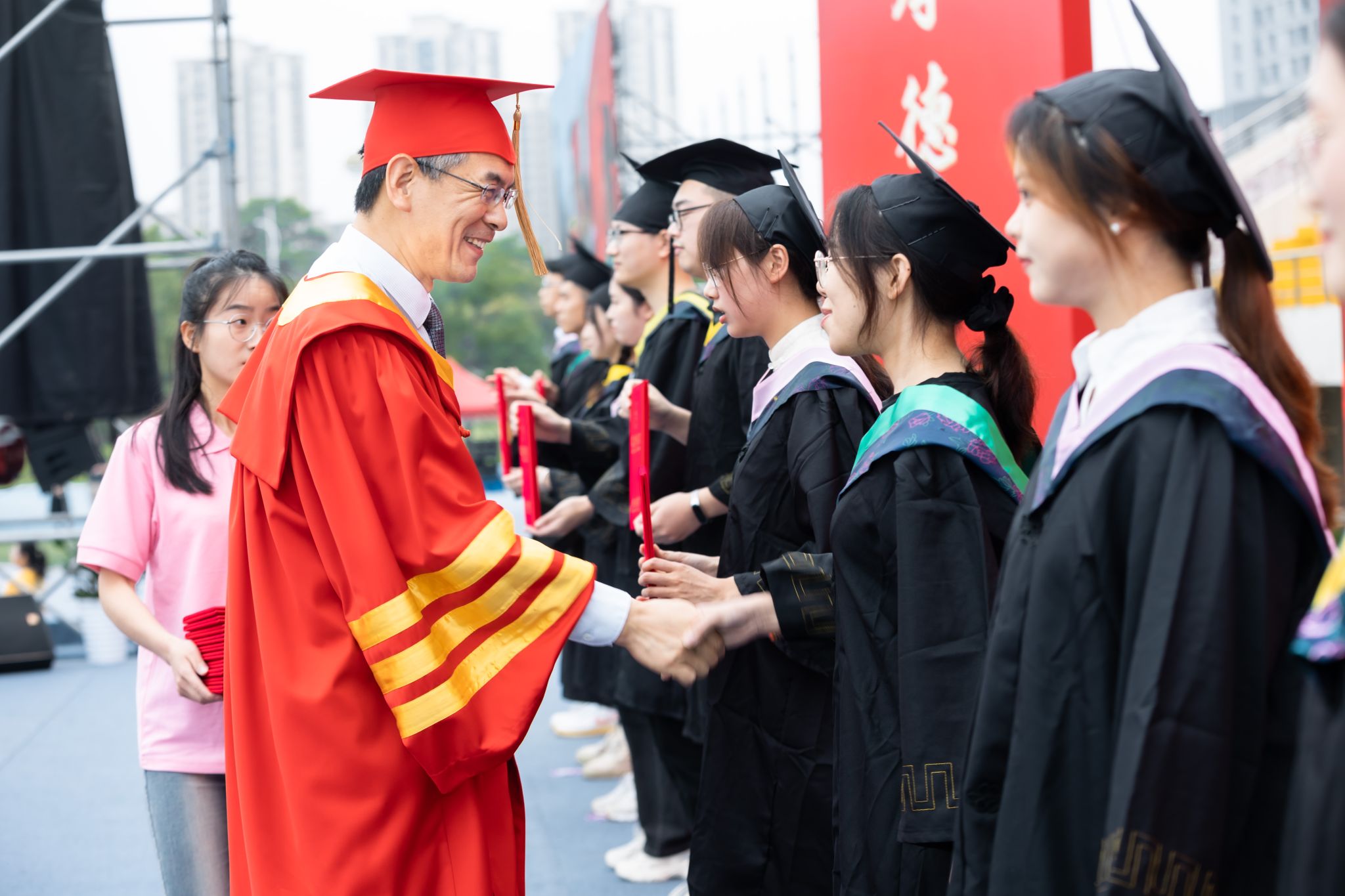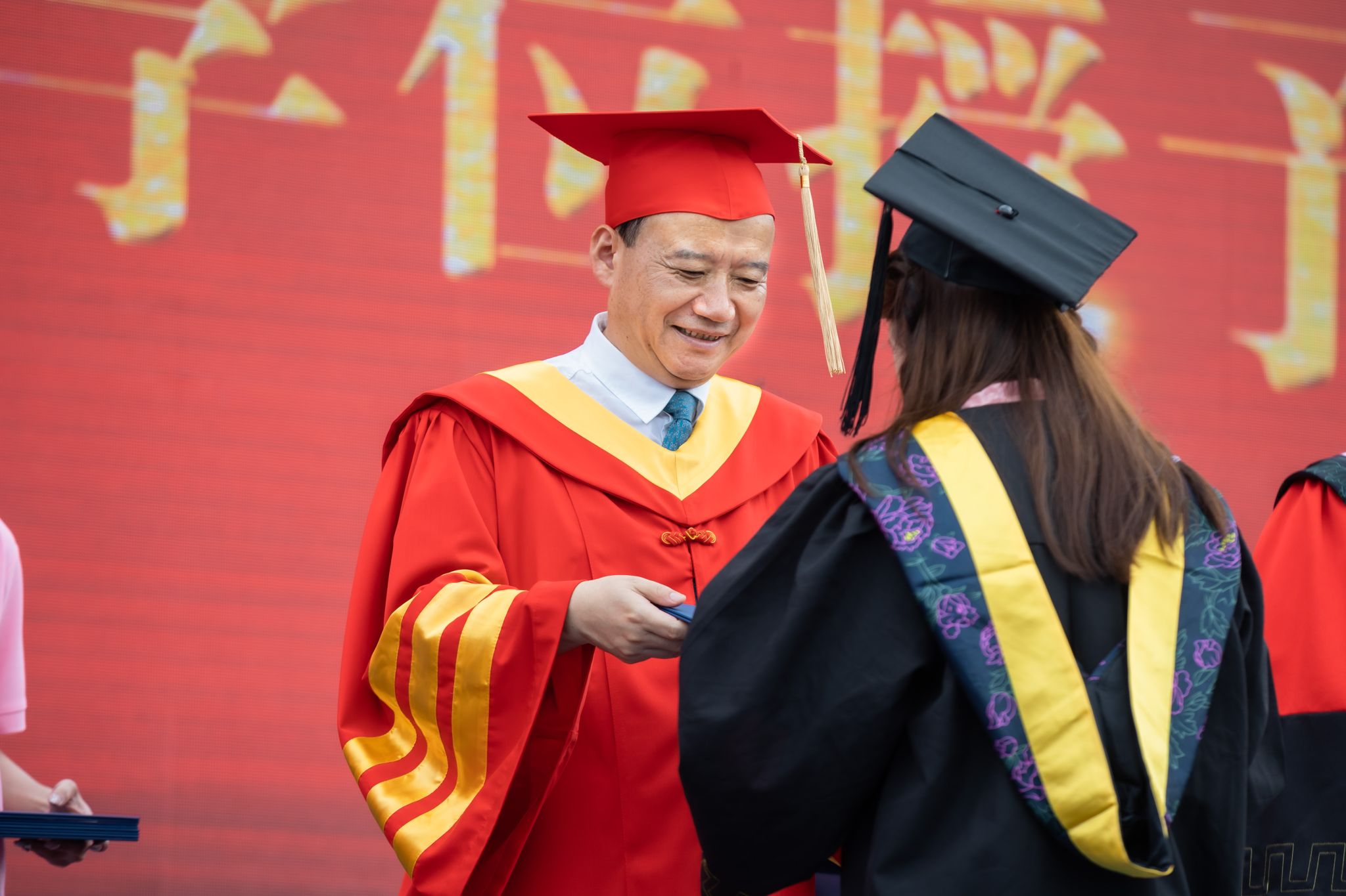 在悠扬的乐曲声中,校领导为现场的毕业生依次拨穗正冠、颁发学位证书并合影留念,定格美好瞬间。