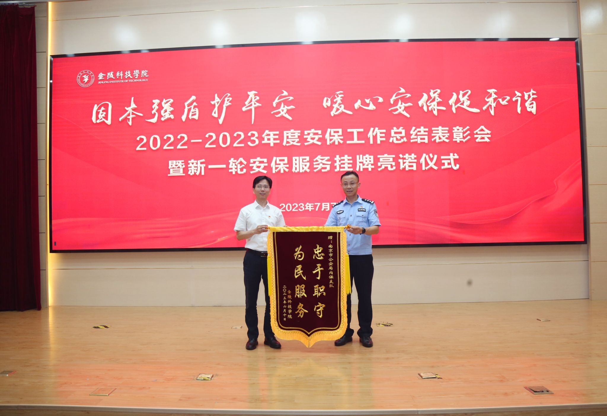 7月7日下午,kaiyun官网在江宁校区科技楼报告厅举行2022-2023年度安保工作总结表彰会暨新一轮安保服务挂牌亮诺仪式。南京市公安局内保支队副支队长卢才勇、江宁分局副局长季海、内保支队特侦大队副大队长刘峰,高新区派出所所长马小虎、教导员俞亮应邀参会,副校长叶智锐出席并讲话。会议由保卫处处长骆德军主持。