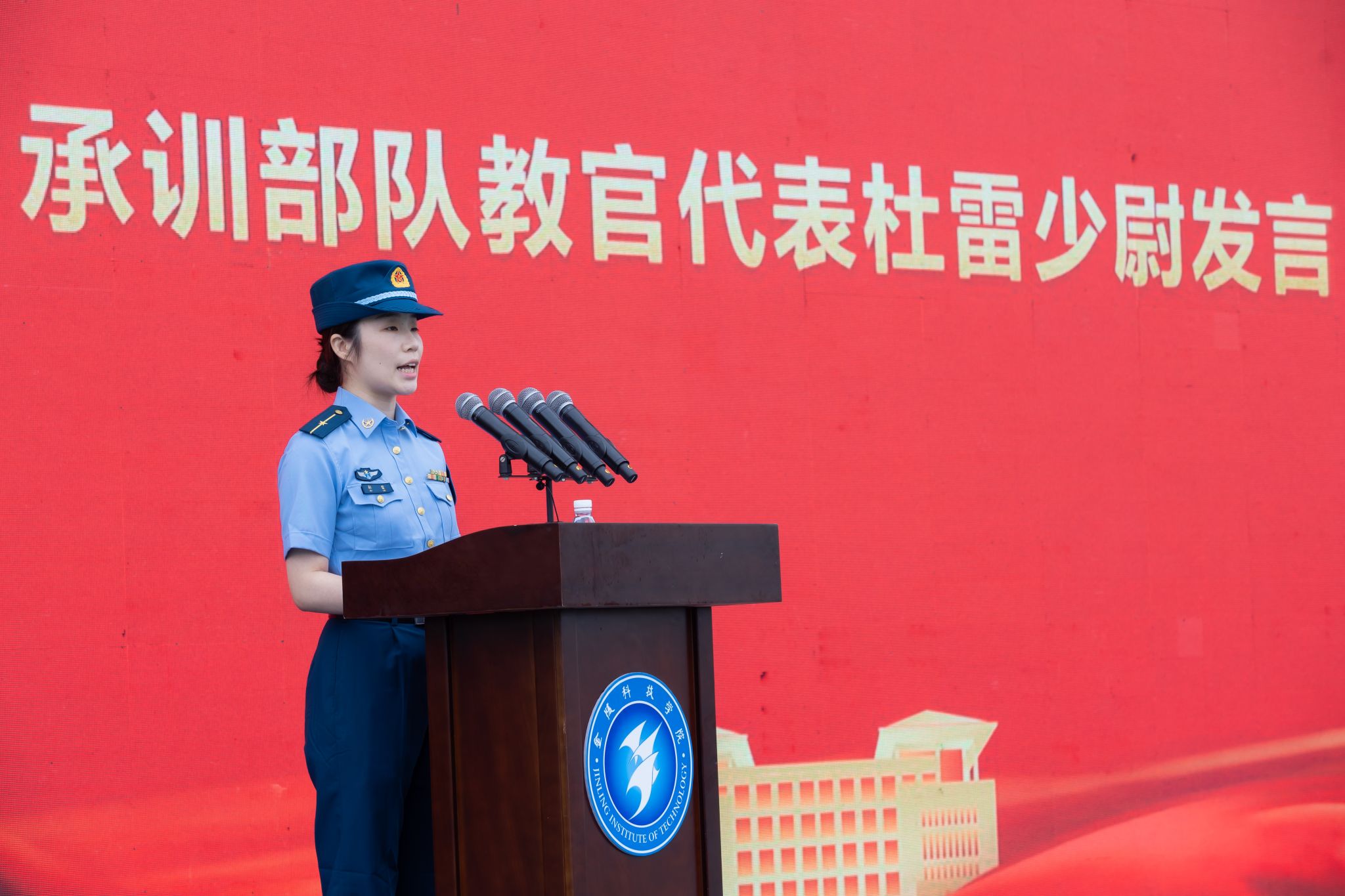 开训仪式上,受训学生代表潘昶润、军训教官代表杜蕾先后发言。承训部队李姬上校宣布2023级新生军训开训命令。