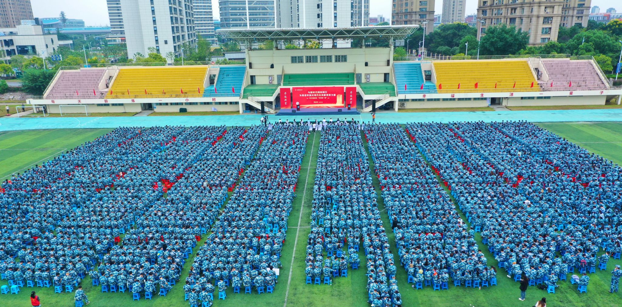 单晓峰在军训开训动员讲话中指出,今年9月是“全民国防教育月”活动,在这个特殊的时间段,希望同学们能保持高昂的斗志,刻苦训练,以优异的成绩,践行“踔厉奋发强国防 勇毅前行向复兴”的庄严承诺!