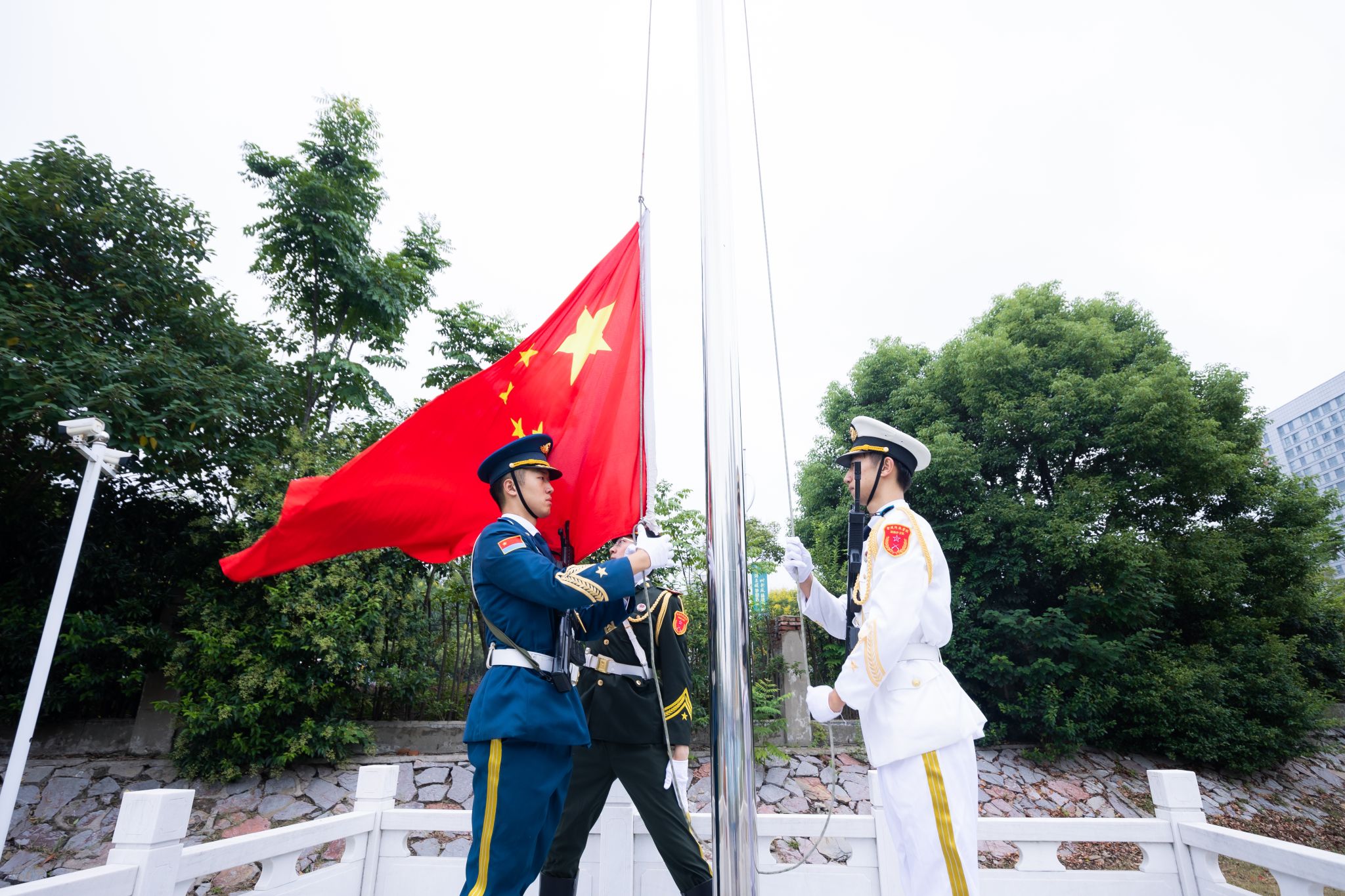 现场举行升国旗仪式,伴随着激昂的国歌响起,鲜艳的五星红旗冉冉升起,现场师生齐唱国歌。