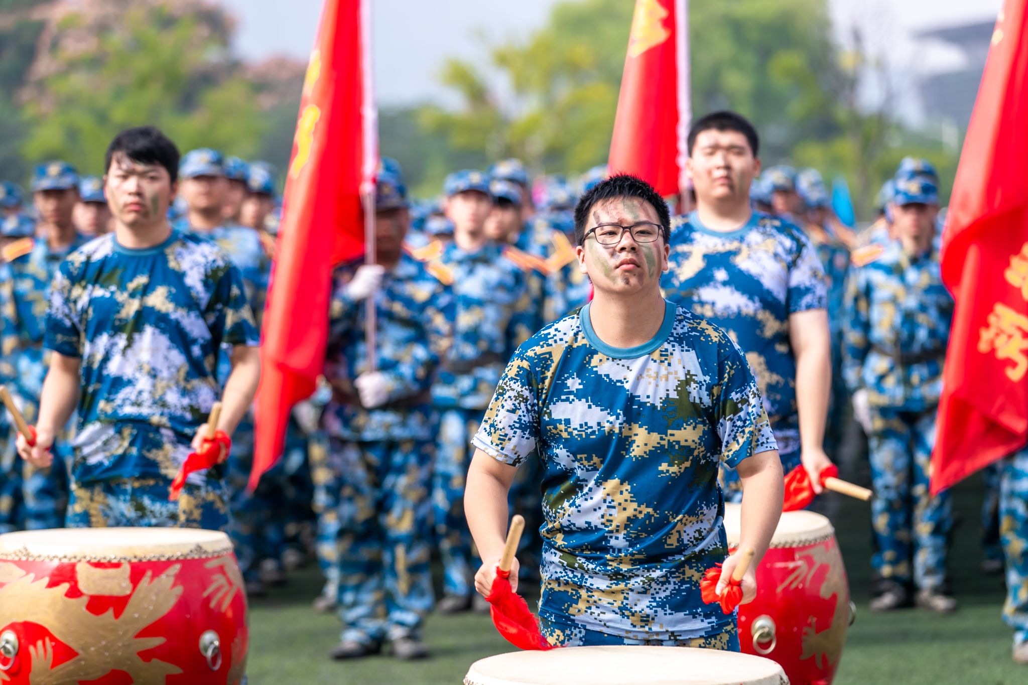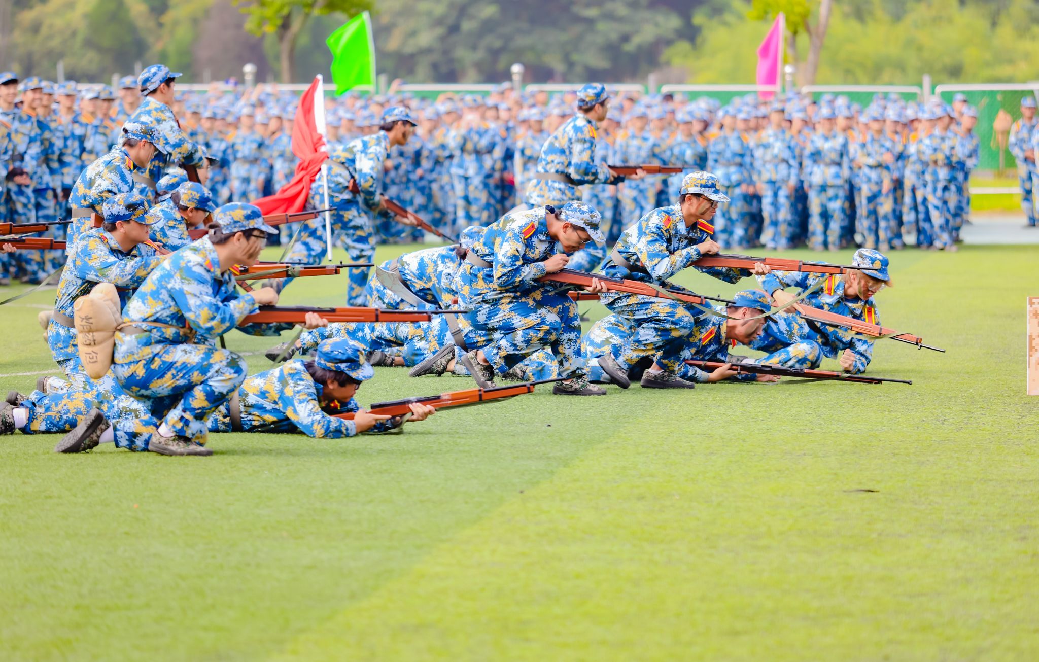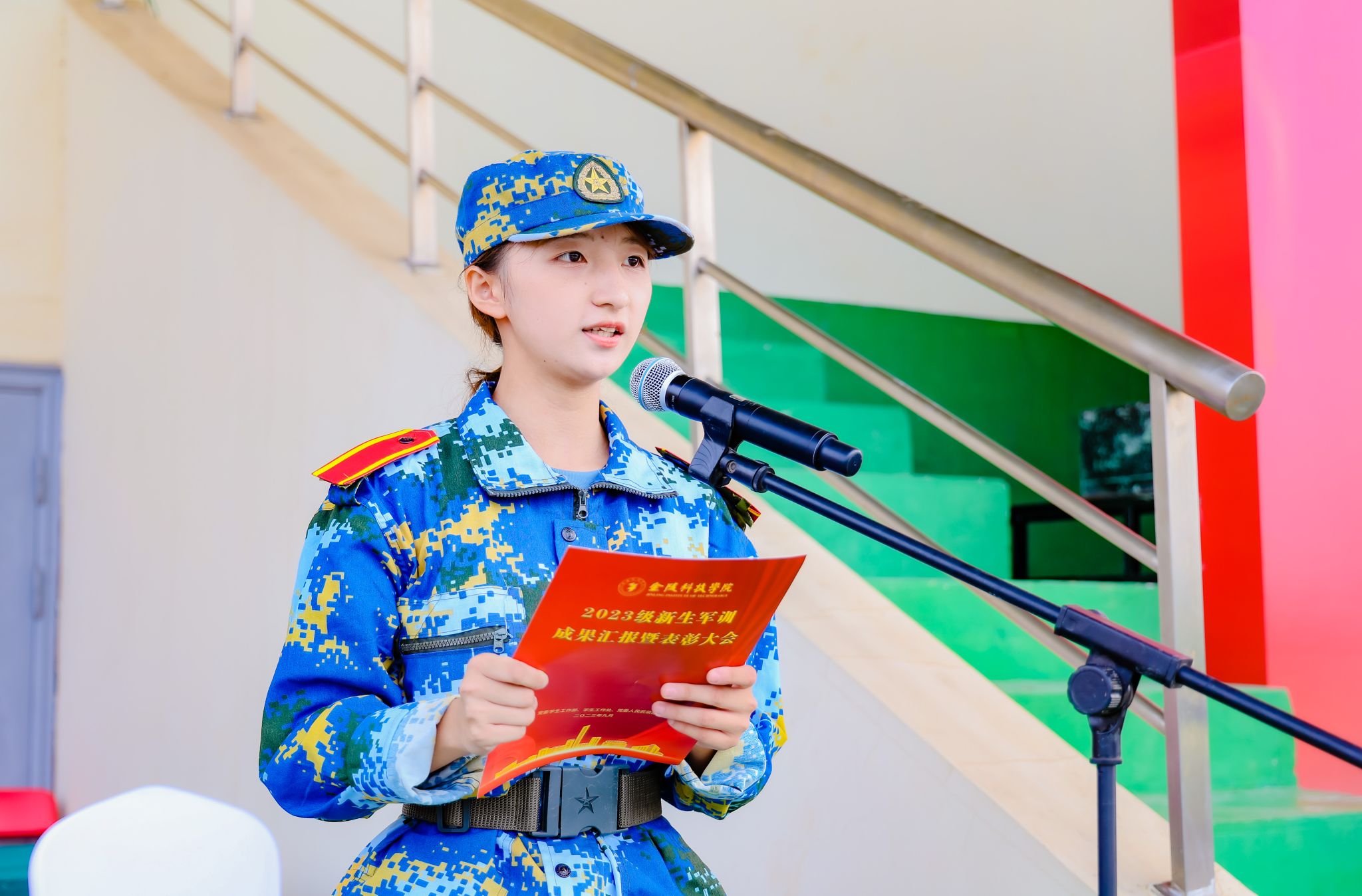 首先举行升国旗仪式,五星红旗在国旗班的护卫下,伴随着雄壮的国歌声冉冉升起。随着刘志远下达“开始”指令,军训汇报正式拉开序幕。分列式上,各学院方阵口号响亮,步伐整齐,展示出良好的军事训练效果。1200名金科学子组成的方阵变化出“2023”“新生”“汇报”“演出”及倒计时的字样,拉开了表演的序幕。擒敌拳、搏击术、匕首操,一招一式行云流水,一进一退攻守兼备,极具视觉冲击。“沉浸式”战术表演使人身临其境,模拟战场狼烟滚滚,将军训成果汇报表演推向高潮。来自商学院的8名退役复学学生代表向母校报到,充分展示了退役不褪色、换装不换志的军人担当。