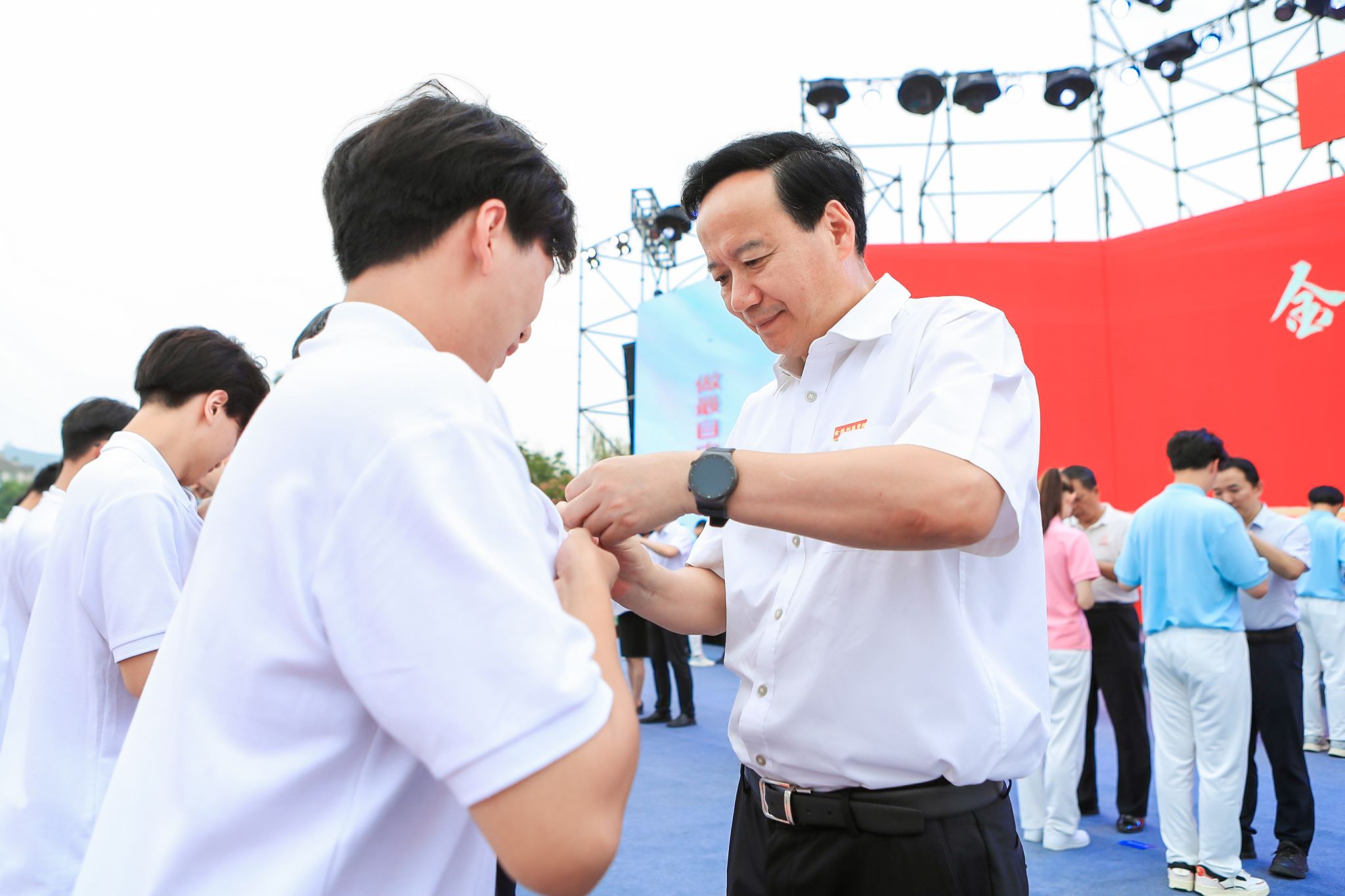 校党委书记刘志远为新生佩戴校徽