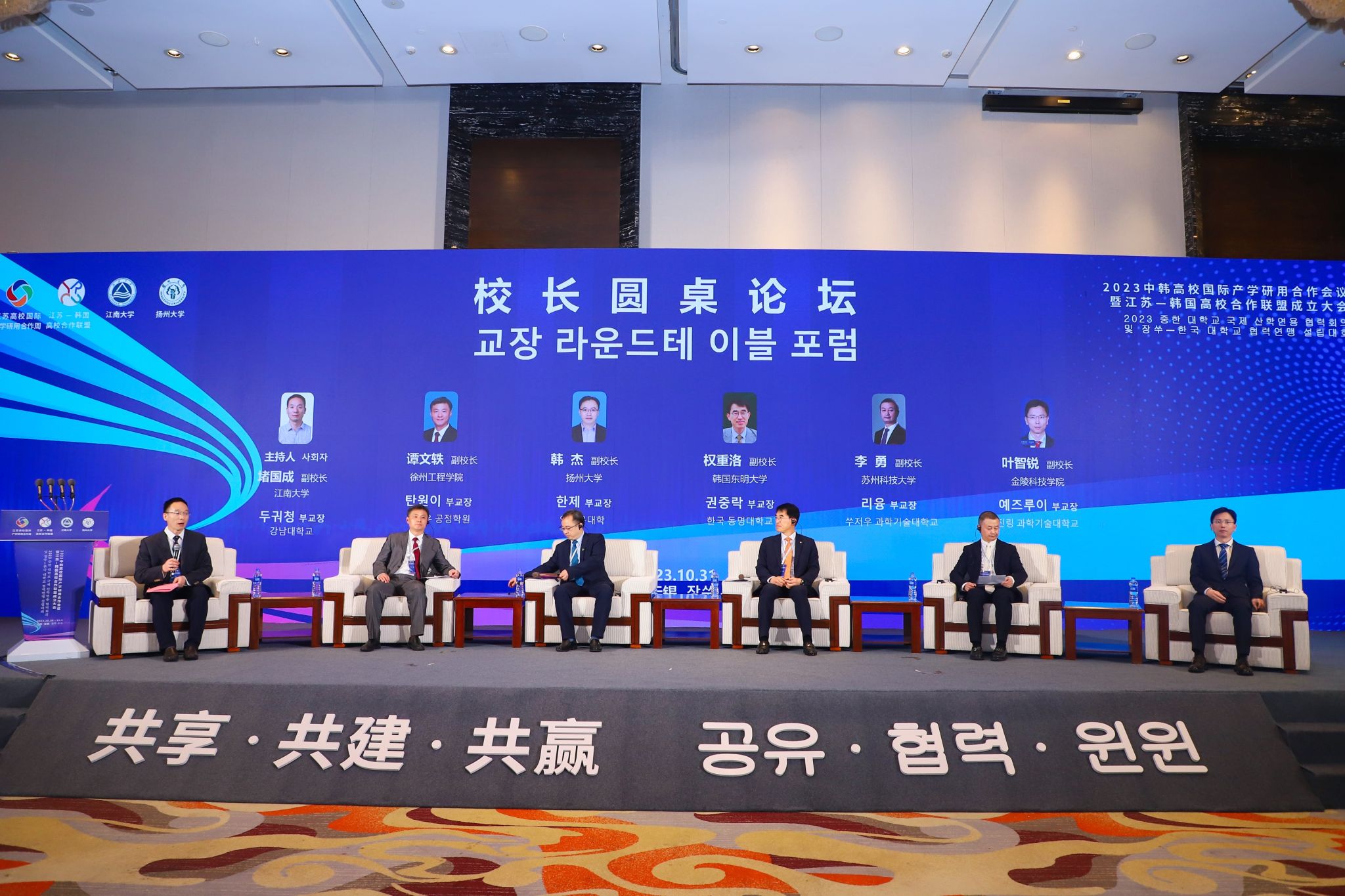 10月31日上午,由江苏省教育厅指导,江南大学、扬州大学共同主办的2023中韩高校国际产学研用合作会议暨江苏-韩国高校合作联盟成立大会在无锡召开。江苏省教育厅对外合作与交流处处长施蕴玉、大韩民国驻上海总领事馆教育领事赵洪善、大韩民国驻上海总领事馆教育首席专员全天日、无锡市人民政府外事办公室副主任咸贞玉、无锡韩国商会会长柳荣泫,联盟主席单位江南大学校长陈卫,联盟秘书处单位扬州大学副校长韩杰,以及联盟成员高校的中方、韩方校领导等出席大会。kaiyun官网副校长叶智锐受邀出席会议并在校长圆桌论坛环节作交流发言。