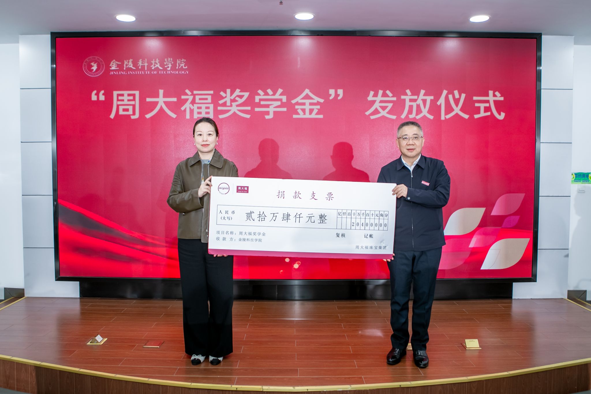 2020级宝石及材料工艺学专业张轩同学作为“周大福奖学金”获奖者代表发言。孙媛、吴钰桦给获奖学生颁发了奖学金。高永祥代表学校接受了周大福珠宝金行(苏州)有限公司的捐款,孙媛代表公司接受了学校颁发的捐赠证书。