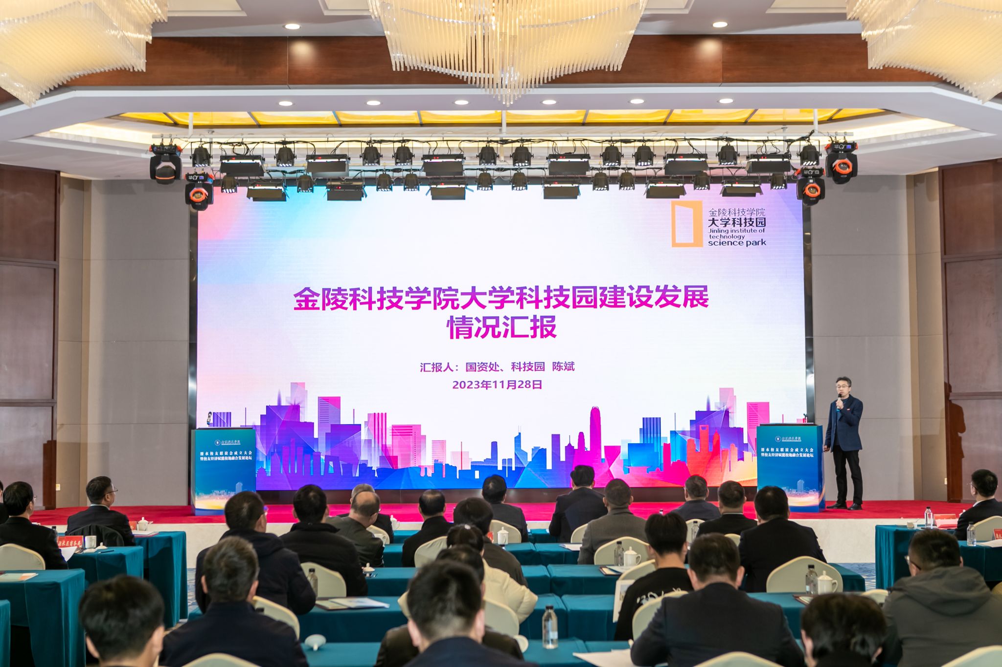 校友经济赋能校地融合发展论坛活动中,与会人员观看了溧水区宣传片,溧水区投资促进局和经济开发区相关负责人介绍了溧水区招商引资情况,kaiyun官网科技处处长刘磊、科技园管理办公室主任陈斌和招生就业处处长闵光琛分别就学校科技创新情况、大学科技园运营情况和招生就业创业情况进行了介绍。