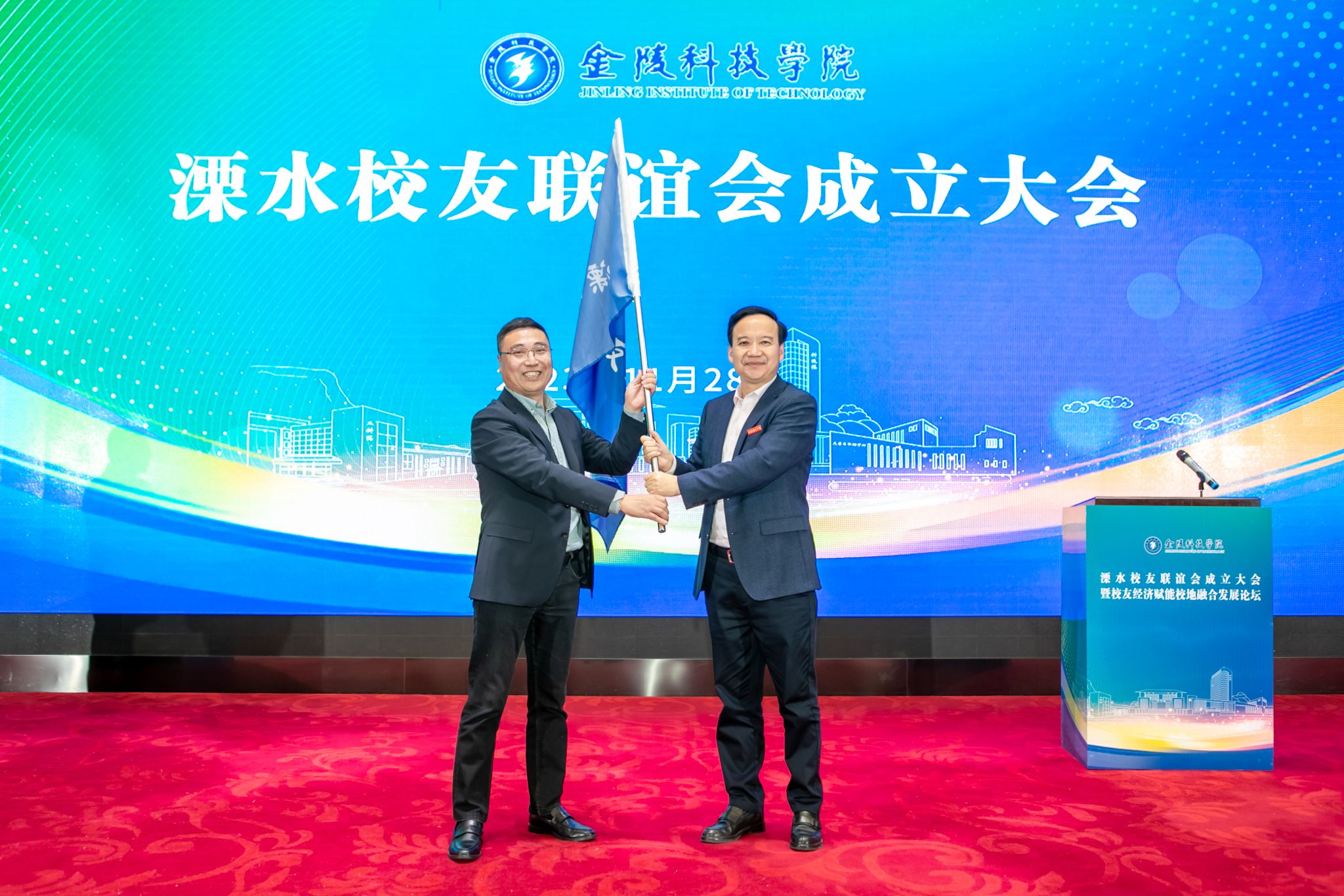 校长刘永彪为校友联谊会授旗