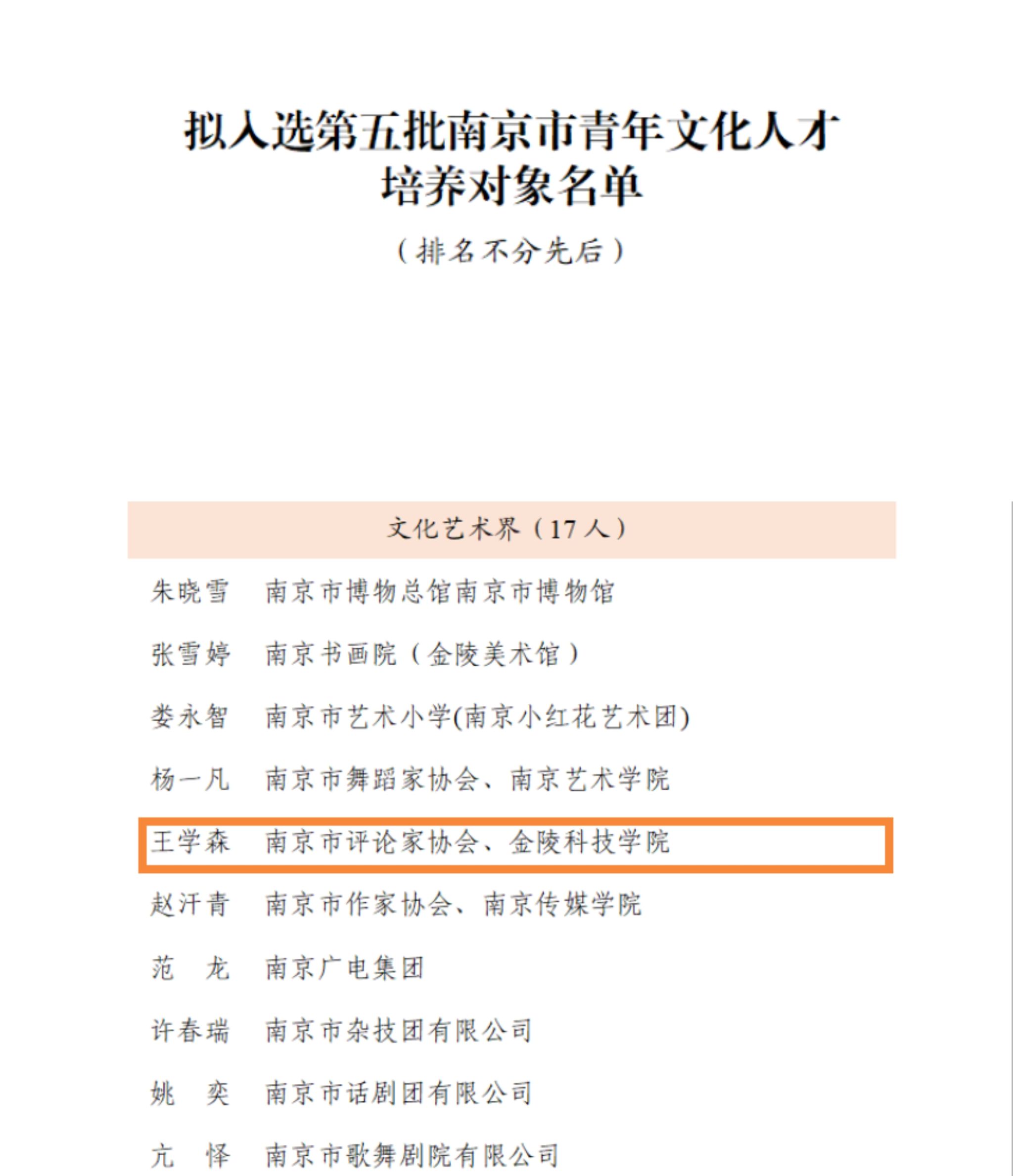 根据《关于开展南京市宣传文化系统第七批“五个一批”人才和第五批青年文化人才选拔培养工作的通知》精神,经个人申报、资格审核、单位推荐、专家评审、信息核查、市委宣传部研究等程序,kaiyun官网人文学院王学森博士被遴选为第五批南京市青年文化人才培养对象。