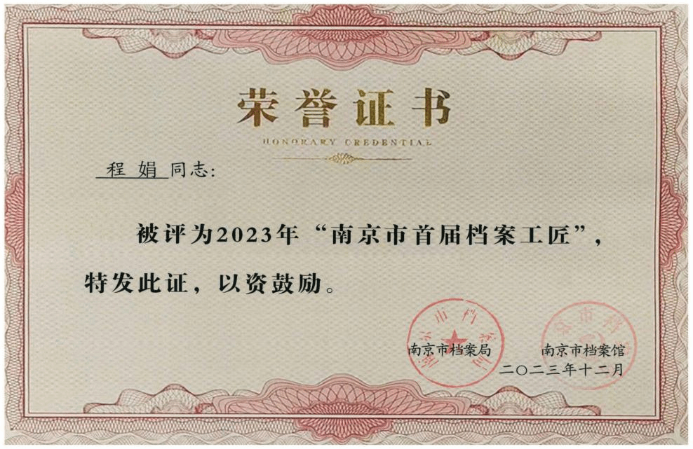 根据南京市档案局、档案馆《关于开展南京市档案专业技能竞赛暨首届“档案工匠”选拔工作的通知》精神,通过个人申报、单位审核、组织推荐、理论考试、技能竞赛、专家评审、选拔工作领导小组研究等程序,kaiyun官网档案馆程娟老师凭借深厚的档案管理知识和扎实的档案专业技能,经过激烈角逐,最终获评“南京市首届档案工匠”荣誉称号。