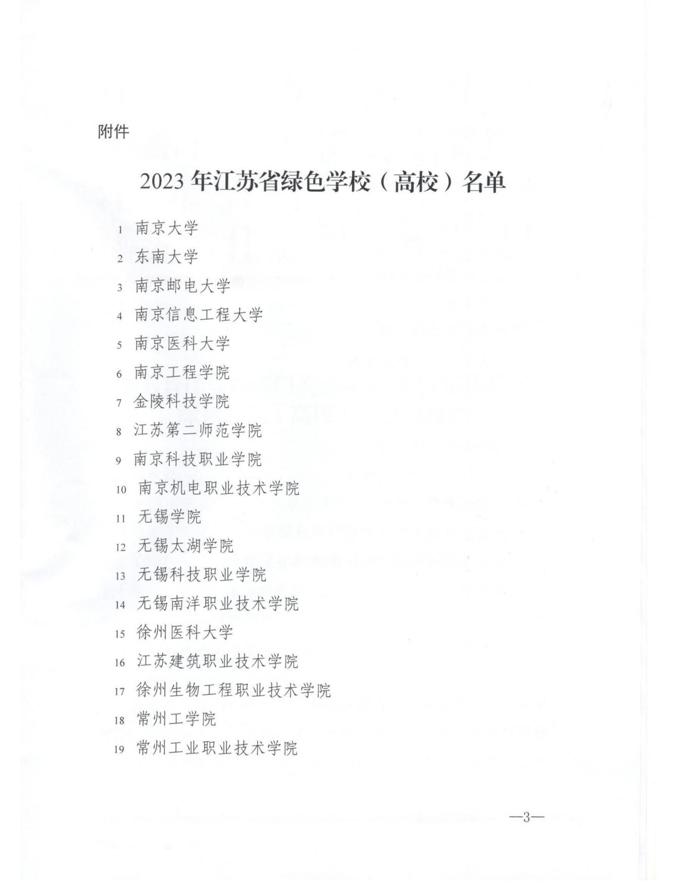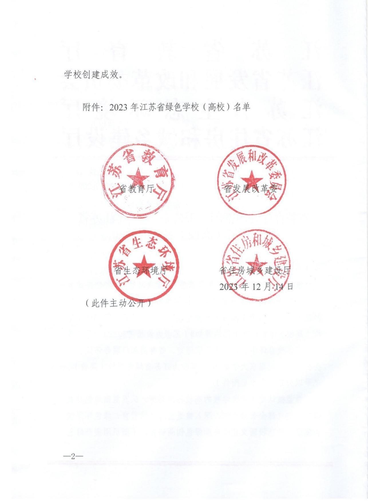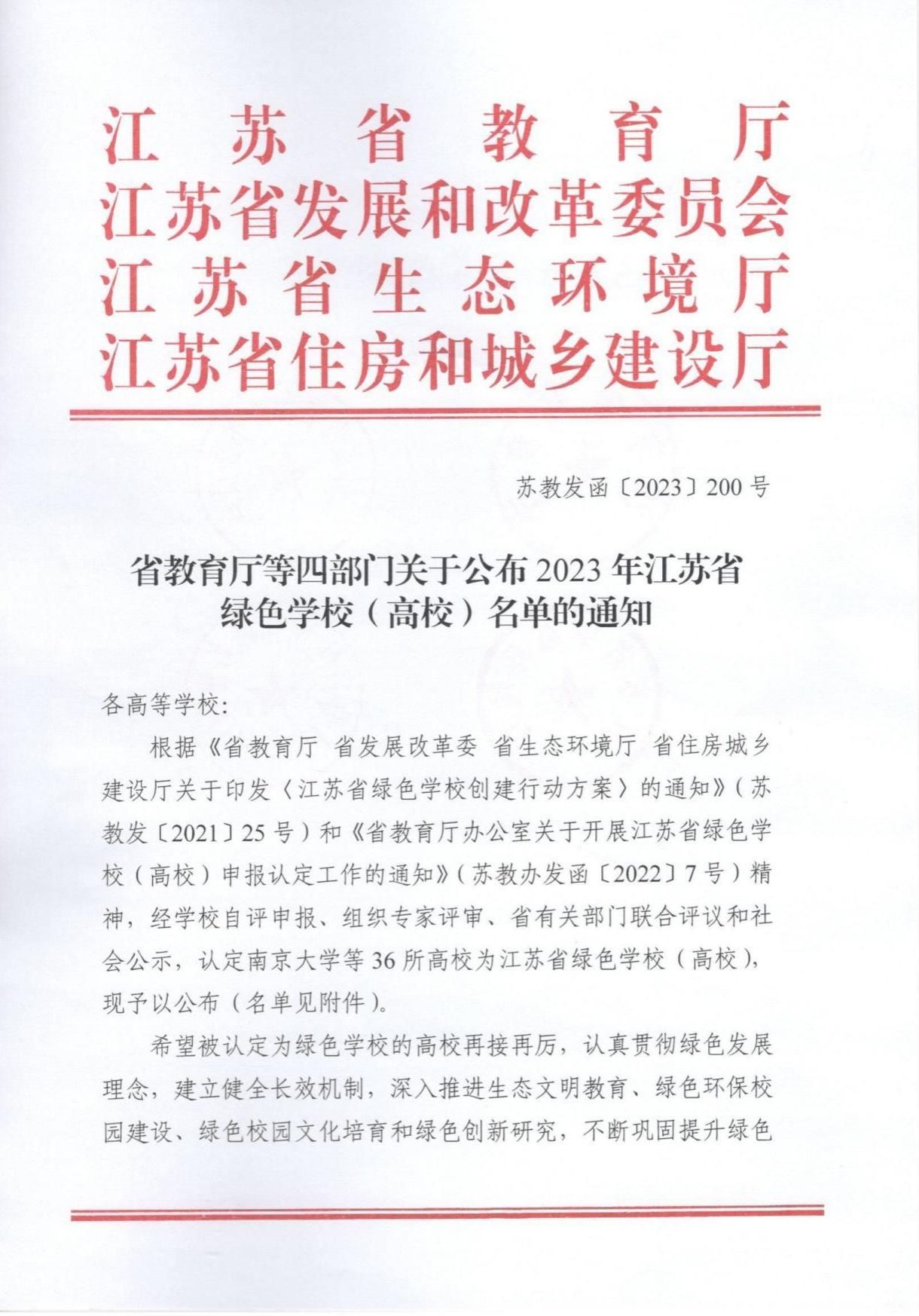近日,省教育厅、省发展改革委、省生态环境厅、省住房和城乡建设厅联合发文公布2023年江苏省绿色学校(高校)名单,kaiyun官网荣列其中。