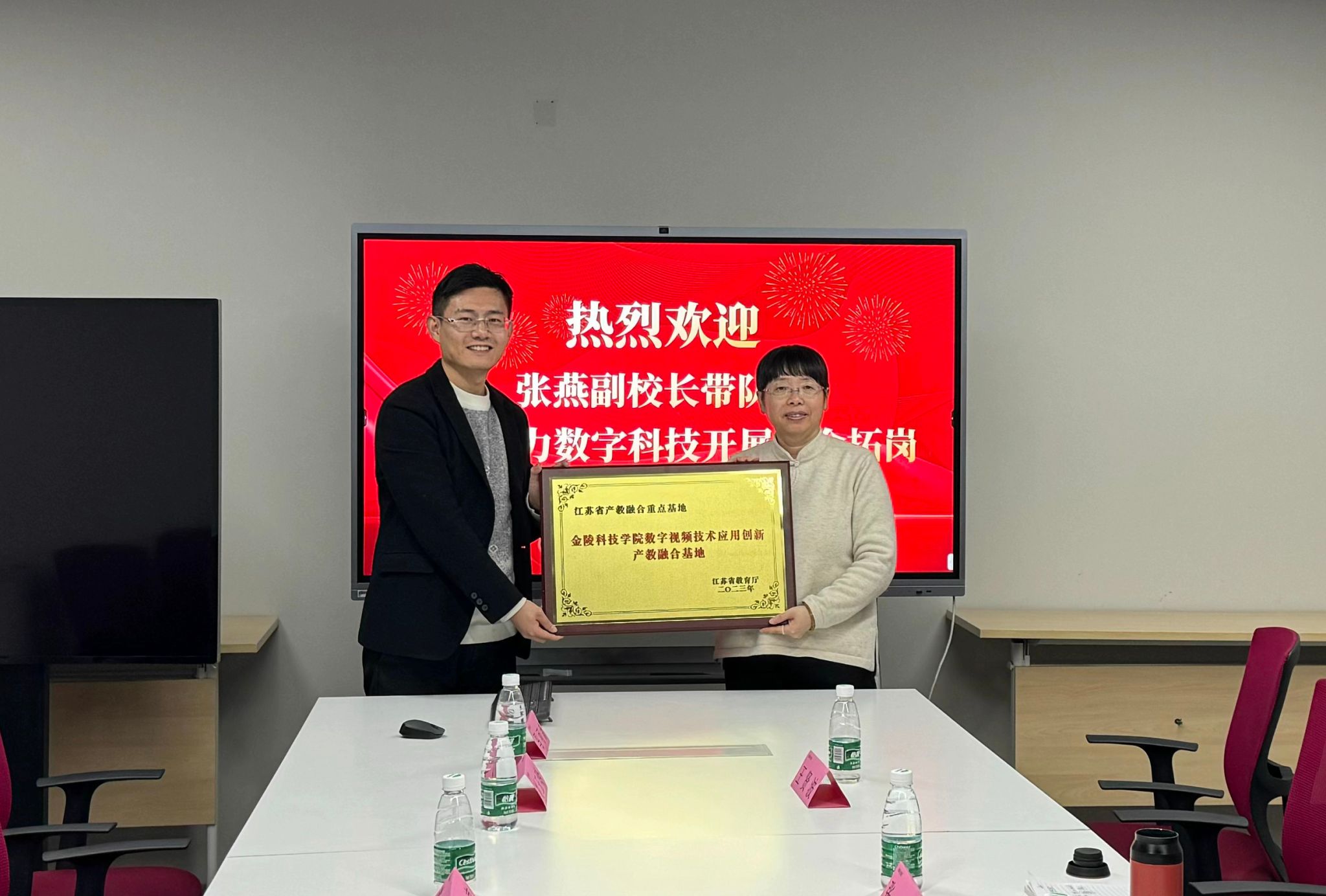 张燕为江苏原力数字科技颁发了江苏省产教融合重点建设基地铜牌,并参观了江苏原力数字科技动作捕获和数字人制作基地,原力公司汇报双方共建数字人制作基地事宜。