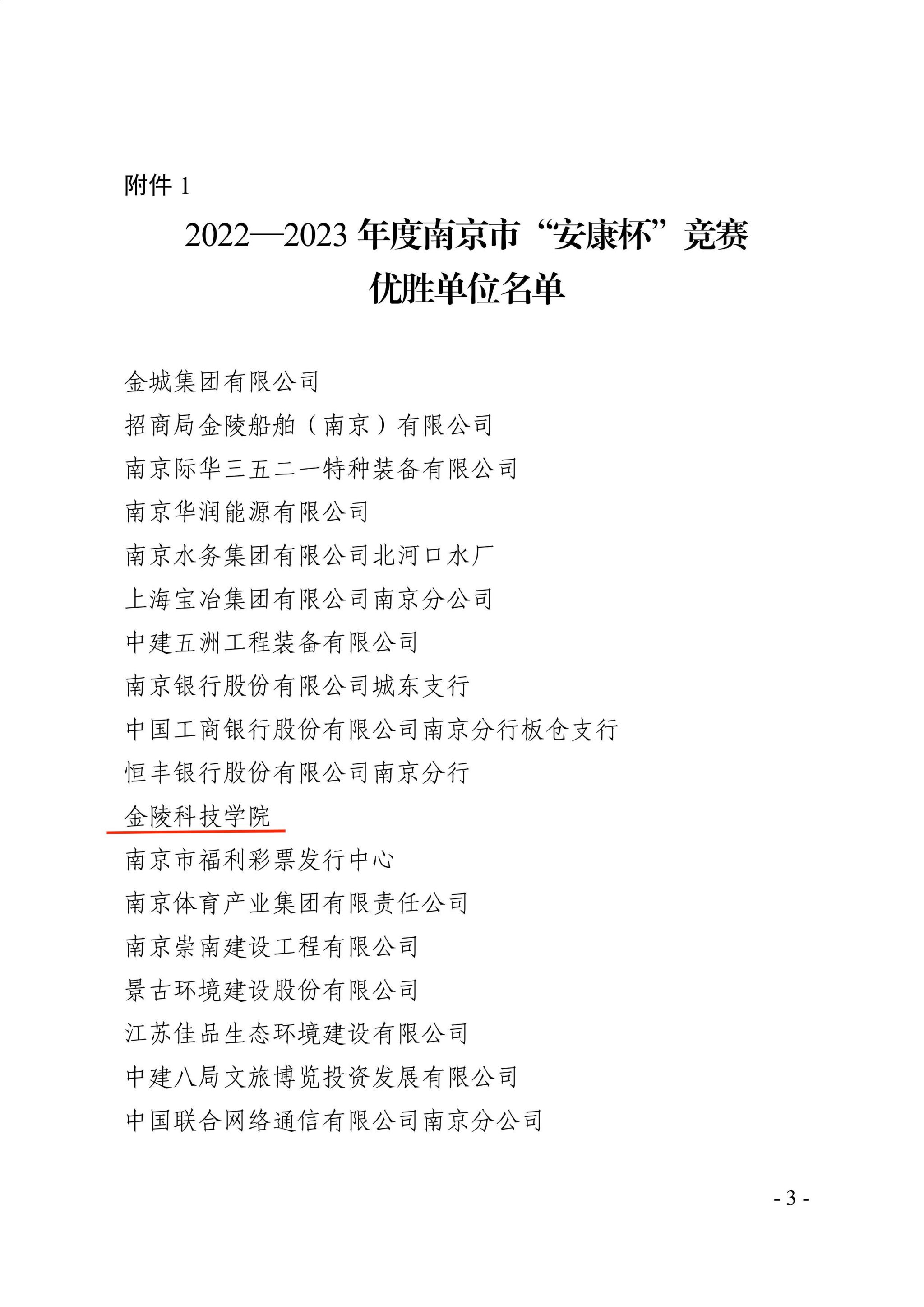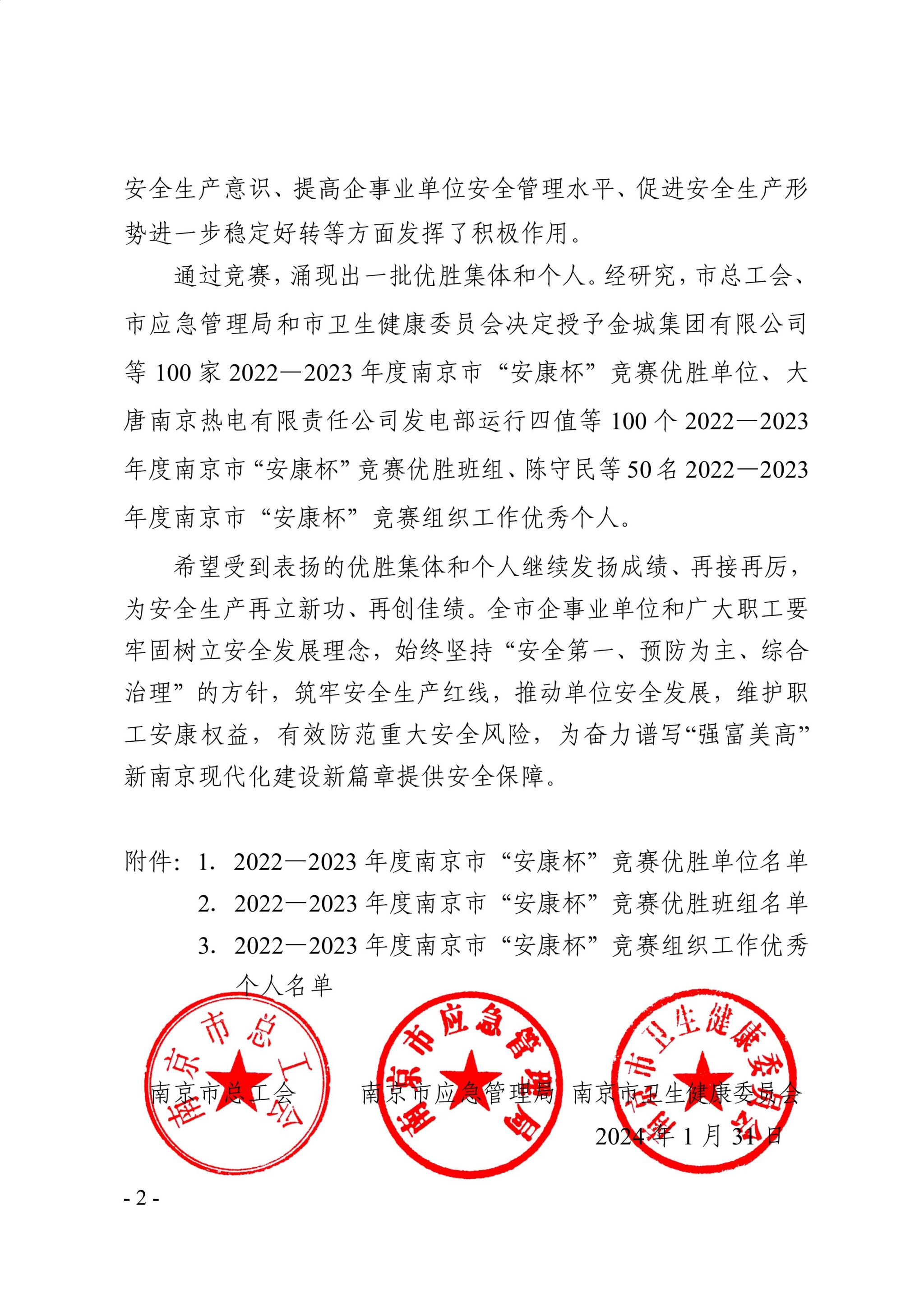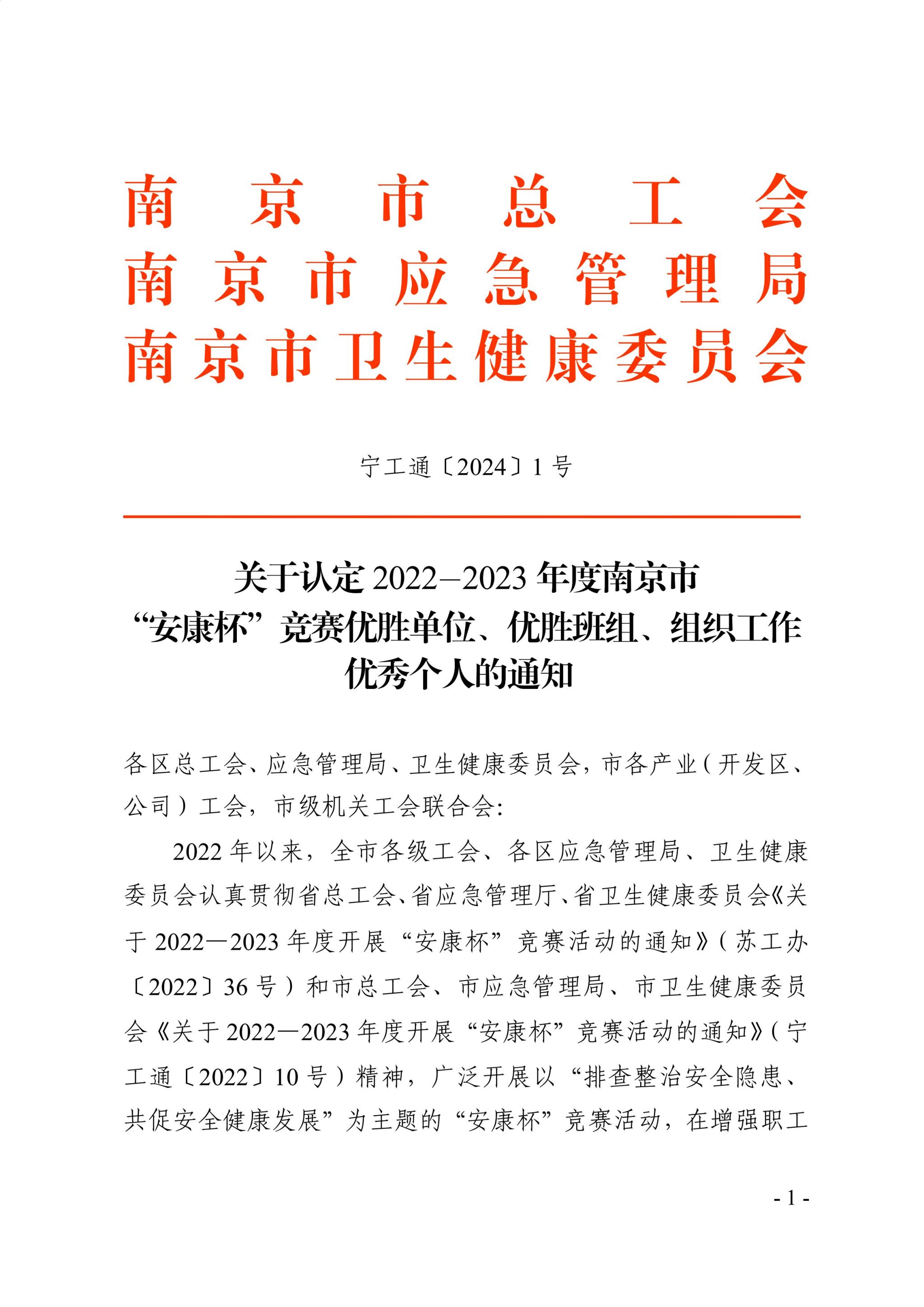 近日,南京市总工会、南京市应急管理局、南京市卫生健康委员会联合发布《关于认定2022-2023年度南京市“安康杯”竞赛优胜单位、优胜班组、组织工作优秀个人的通知》,kaiyun官网荣获2022-2023年度南京市“安康杯”竞赛优胜单位称号。