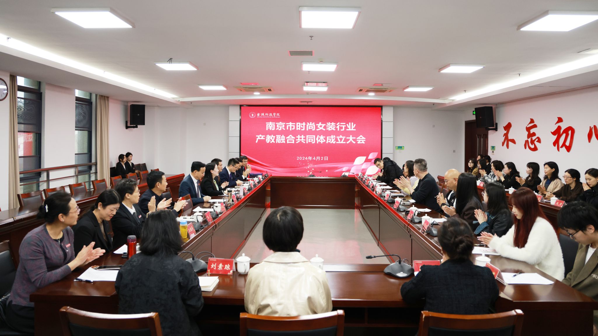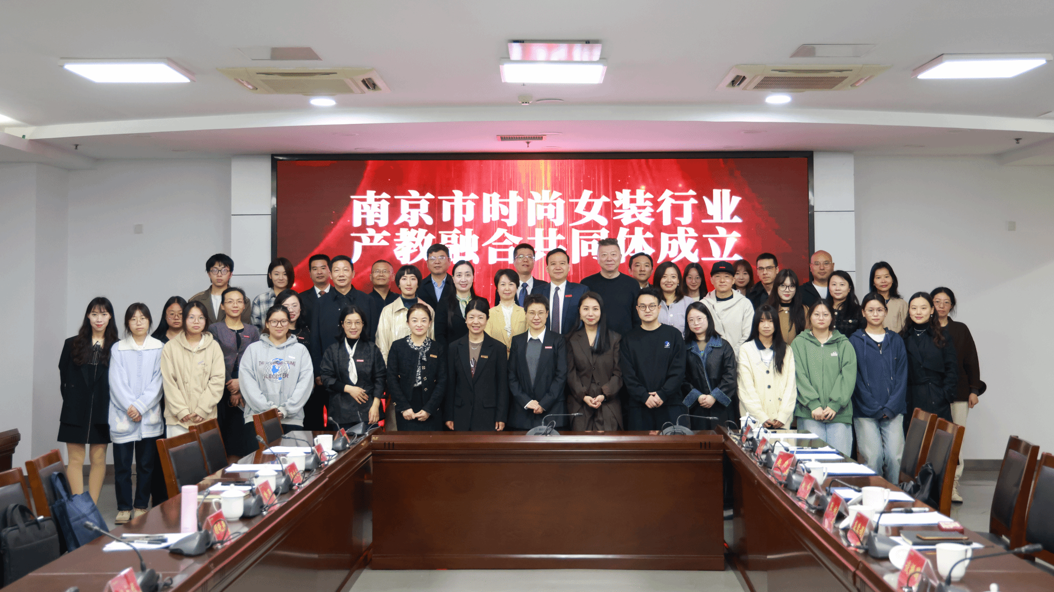 刘永彪、谈振国、姚峰、王利、赵力共同为南京市时尚女装行业产教融合共同体揭牌。会议审议通过了《南京市时尚女装行业产教融合共同体章程》。顾晓燕为谈振国、姚峰、王利、赵力等颁发研究员聘书。