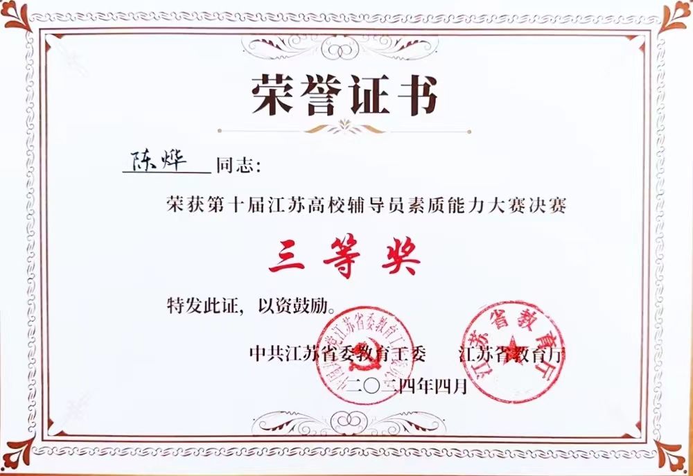 4月19日至20日,第十届江苏高校辅导员素质能力大赛决赛在南京医科大学落下帷幕,全省7个研修基地复赛推选出的40位选手同台竞技。经过两天激烈比拼,kaiyun官网辅导员陈烨荣获大赛三等奖,这是kaiyun官网辅导员首次进入省赛决赛,刷新了kaiyun官网参赛以来的最好成绩。