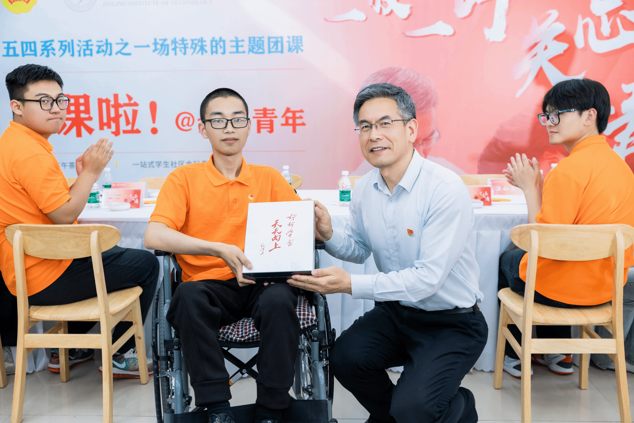最后,刘志远代表学校向周伟赠送了一台能够阅读和手写的电子本,方便他更好地学习。同时,向学生代表赠送了《新时代高校团干部能力提升培训教程》等4本书籍,勉励他们“多读书,多思考,与优秀的人对话,成为更好的自己。”