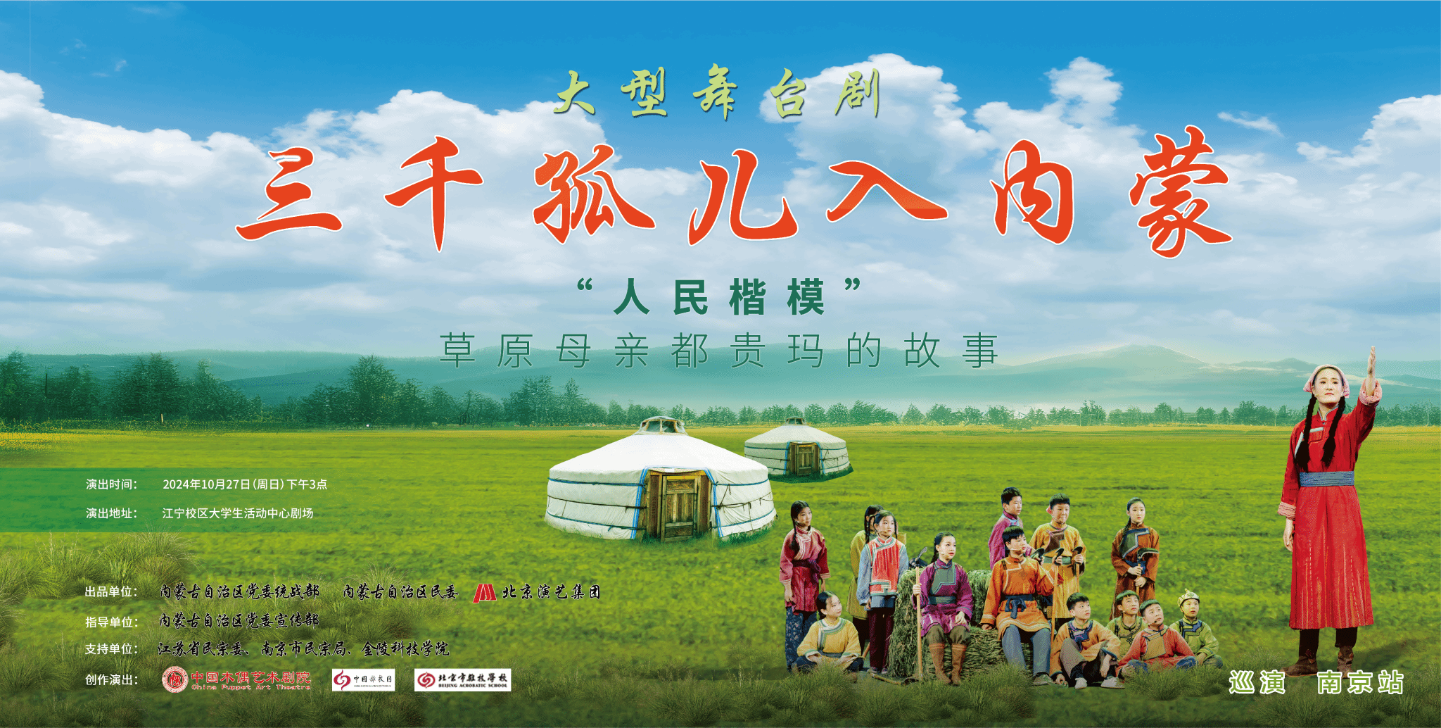 演出单位:该剧由内蒙古自治区党委统战部、内蒙古自治区民委、北京演艺集团联合出品,内蒙古自治区党委宣传部指导,江苏省民宗委、南京市民宗局支持,中国木偶艺术剧院创作,中国木偶艺术剧院、中国杂技团、北京市杂技学校联合演出,kaiyun官网党委统战部、校团委承办。