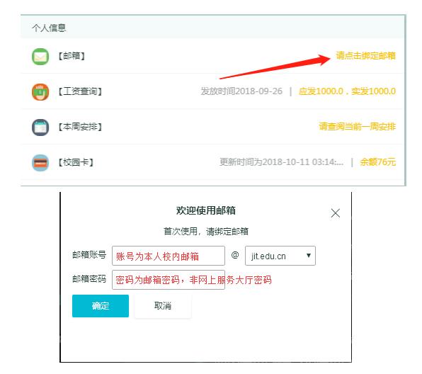 2.在网上服务大厅“个人信息”卡片中绑定个人邮箱,点击“请点击绑定邮箱”,输入邮箱账号和密码,点击确定即可绑定成功,绑定成功以后直接点击邮箱图标进入个人邮箱。