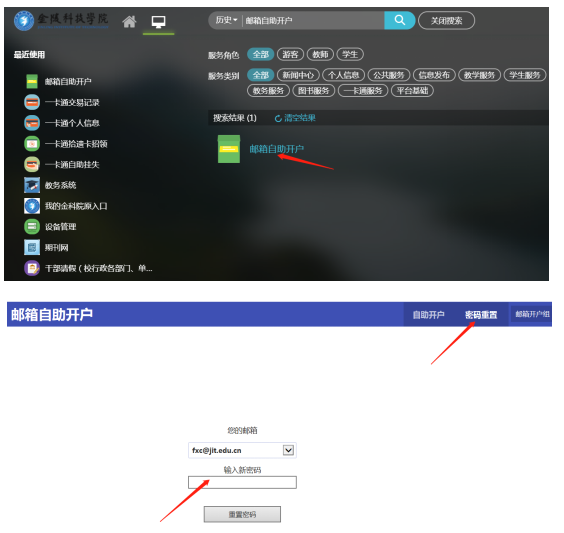 3.绑定时忘记“邮箱密码”如何处理。 点击或搜索公共服务中的“邮箱自助开户”服务,选择右上角“密码重置”,“输入新密码”即可成功重置密码。