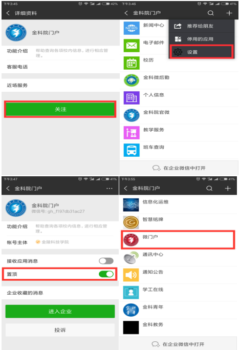 +”号,点击设置,出现金科院门户界面,点击置顶,即可在微信页面顶端点击金科院门户,进入金科院门户界面,在金科院门户中点击标红的微门户,可直接访问网上服务大厅